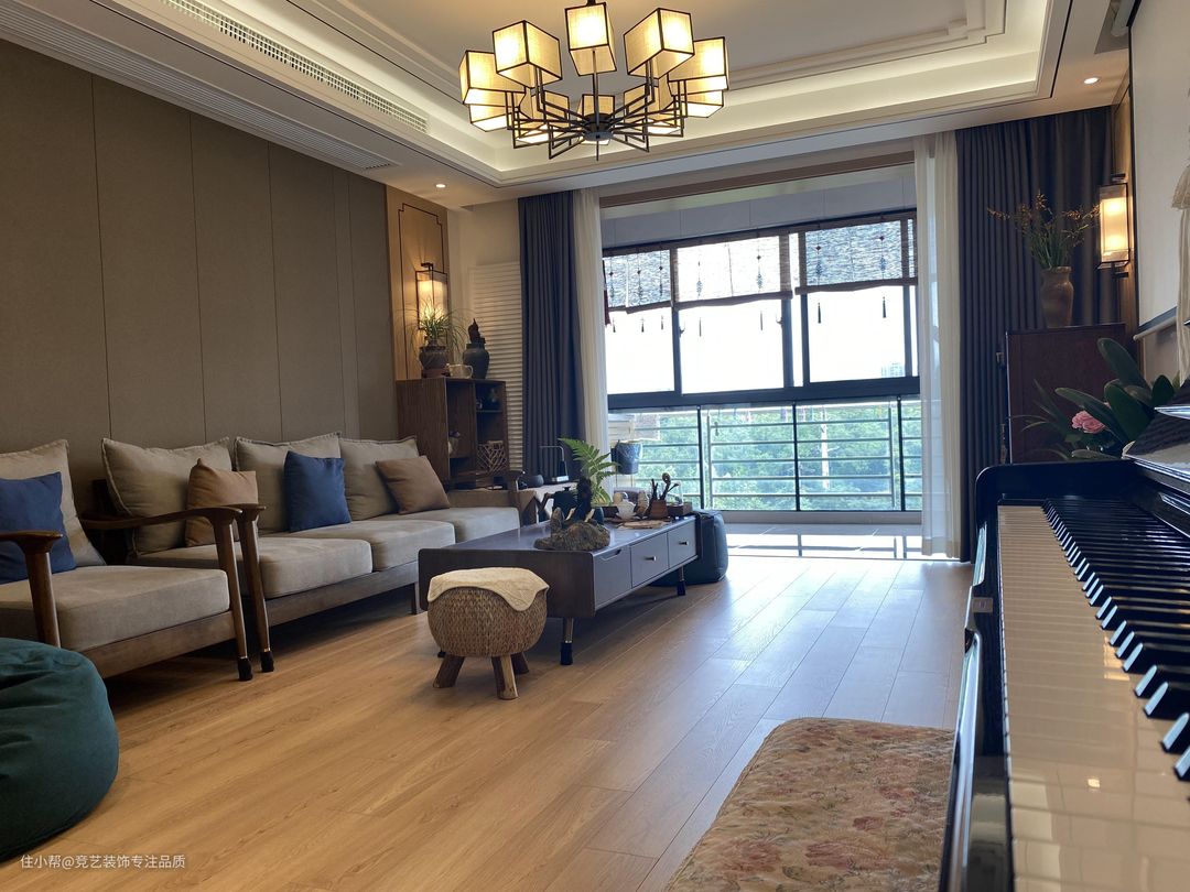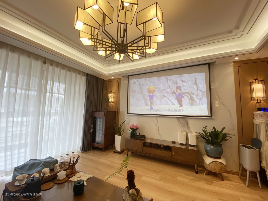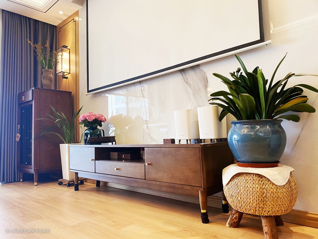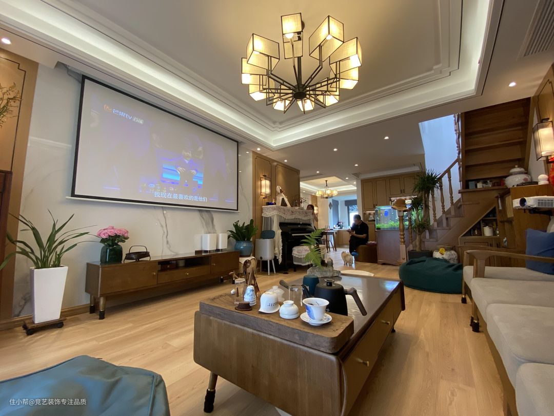 整个客厅的设计感很复古,木纹地板通铺,再搭配上实木的沙发,有种油画的氛围感,电视柜的选择也是纯实木的,简约、收纳性强而且颜值也高,放弃了传统的电视,用投影仪代替,效果更好,客厅是一个家的门面,门面要装好,可以诠释我们的品味,这款中式吊灯更是大气上档次,现代新中式的典范