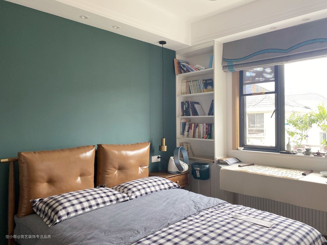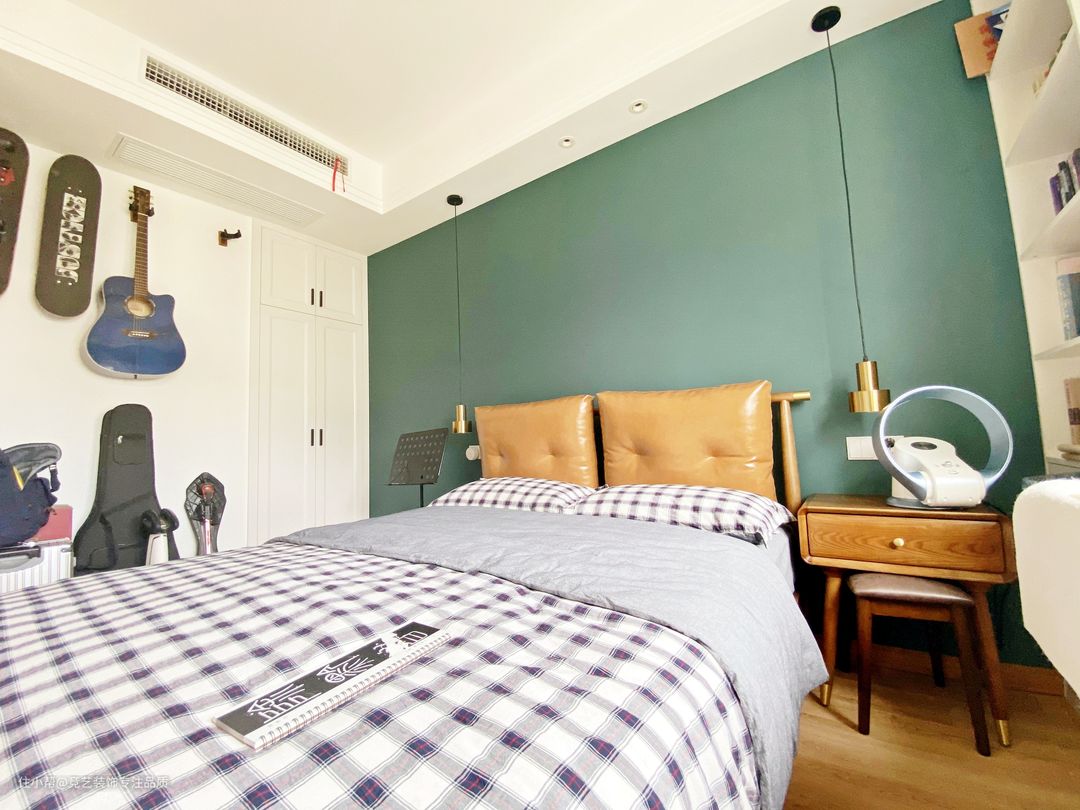 儿童房的设计一复古绿色系为主,森系橄榄绿复古卧室,和春天撞个满怀,在窗户的位置坐一了组书桌,小朋友很喜欢书法,可以坐在窗台边写字,累了可以看看窗外的风景眺望远方,也可以有效的保护眼睛