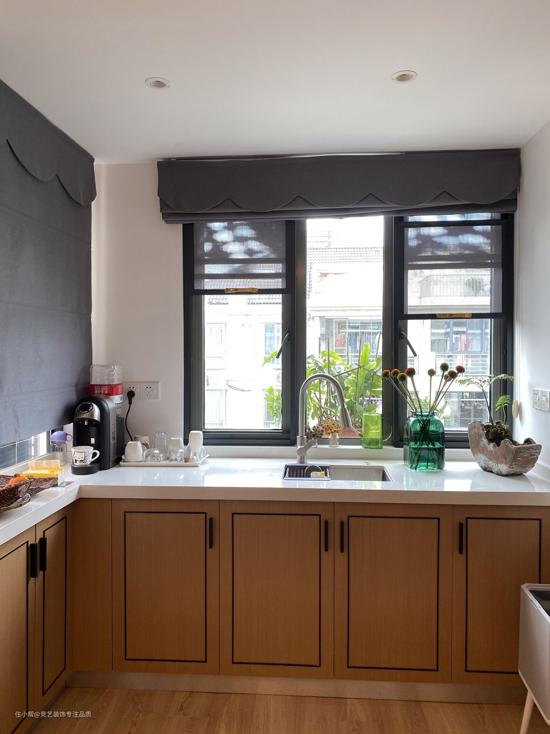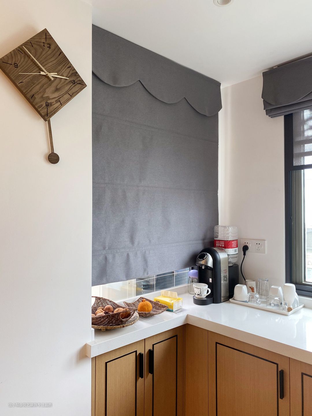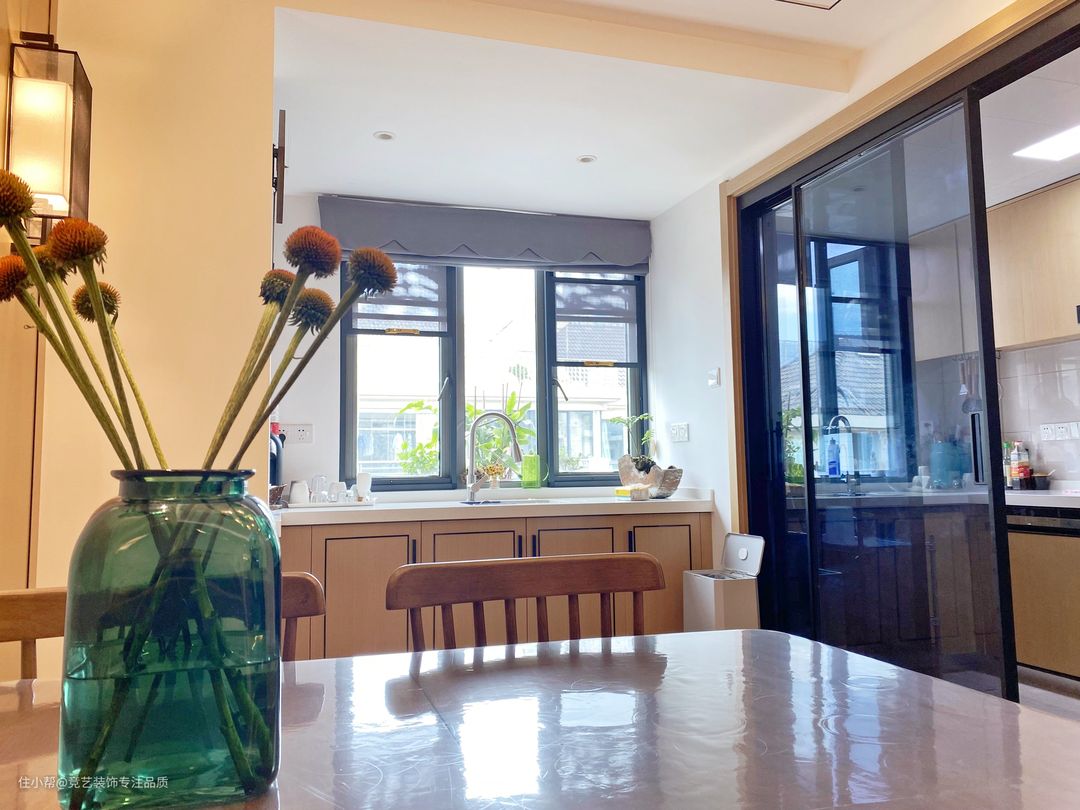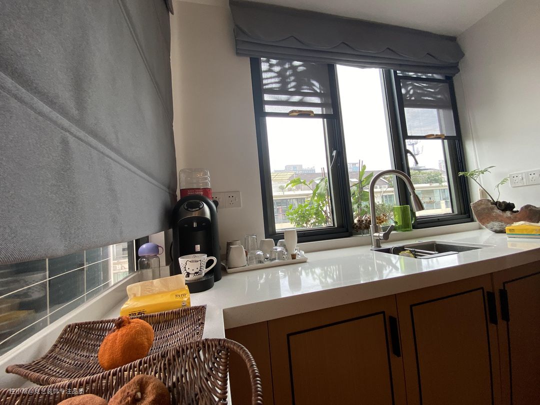 厨房外面的小阳台靠窗的位置我们也是做了一组吧台,不影响采光,多了收纳和水吧功能,以窗为景,开辟属于自己的coffee time