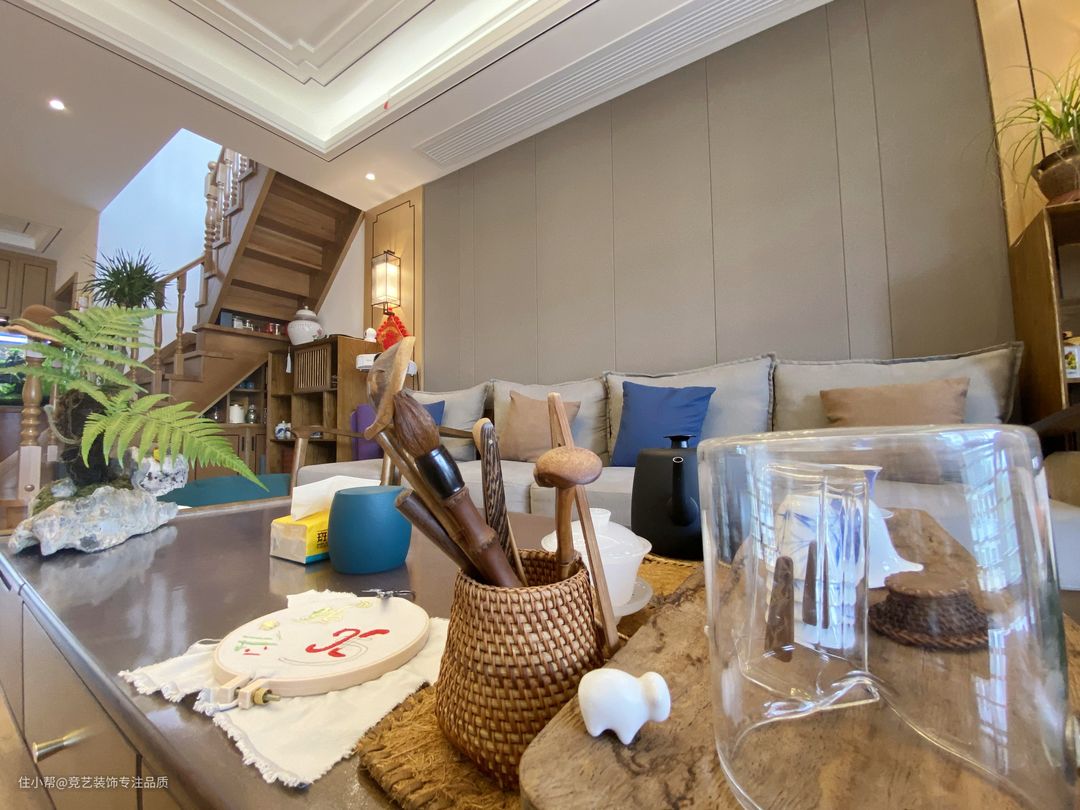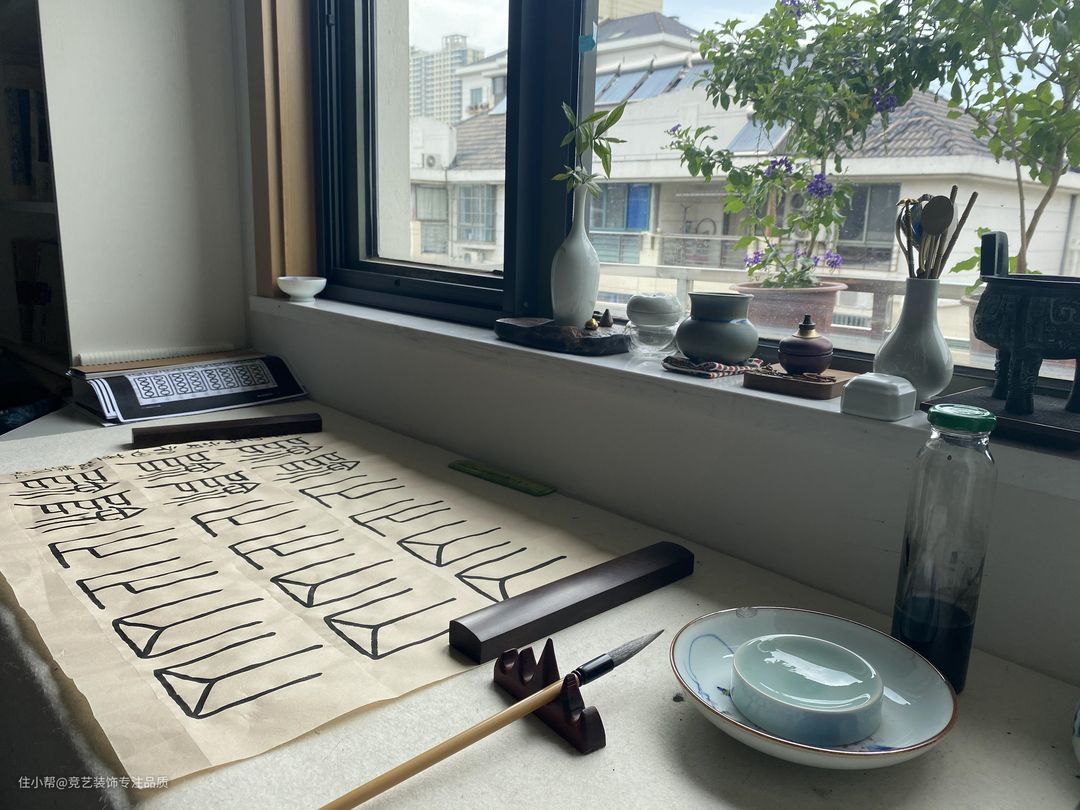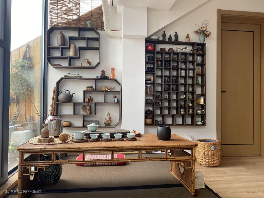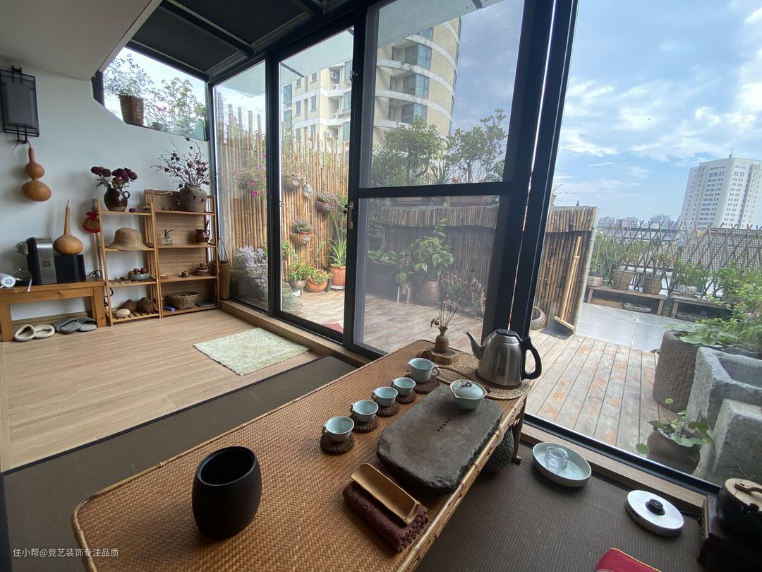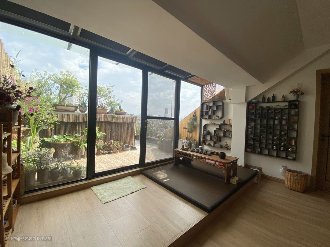 生活区的阳台是全景落地窗,地面做了抬高处理,右侧放置了一组茶桌,在后面的墙壁上做了很多的开放格,摆放上装饰品很有古典韵味