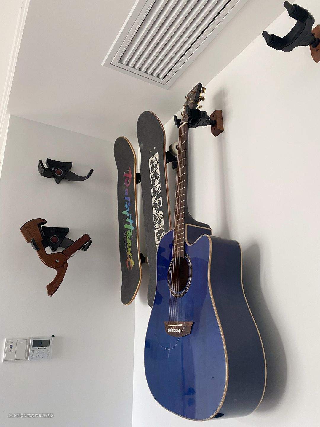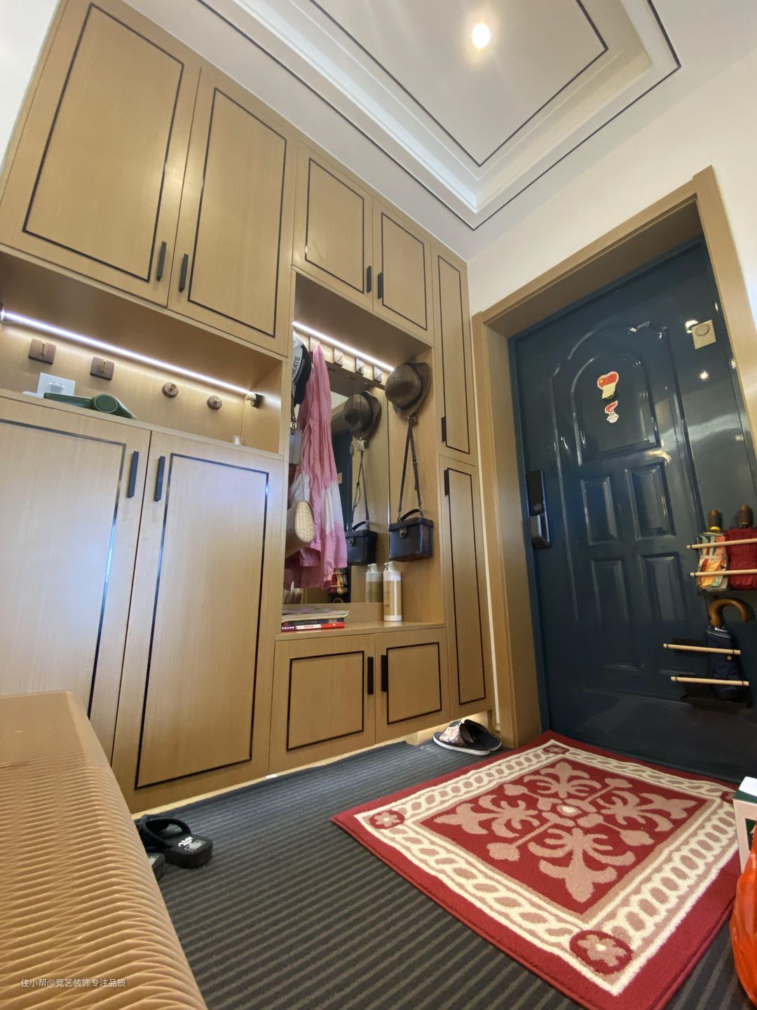 整个家的柜体选择上都是原木色系,跟木地板的颜色相呼应,在入户玄关的地方做了一组入户鞋柜,进门位置做一组卡座换鞋柜,定制挂衣钩,方便挂衣帽;鞋柜做分段设计,中间做开放格,用来放一些展示摆件,提升仪式感