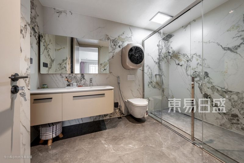 在主卫空间的改造中,设计师根据实际需求进行了大刀阔斧的改动。干湿分离的卫生间设计,将双台盆洗漱区外置,并利用过道做整墙收纳,满足了卧室的收纳需求。这样的设计不仅提高了卫生间的使用效率,同时也增加了储物空间,使整个空间看起来更加整洁、有序。