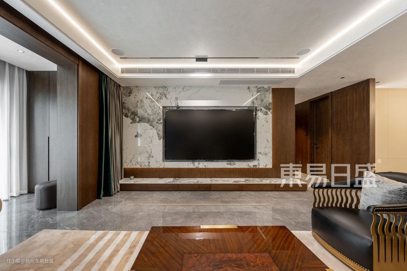 设计师在客厅改造中,充分利用了原始横厅的空间优势。通过将阳台空间并入客厅,采用灰色系大理石纹地砖通铺的方式,成功地延展了视觉效果。为了营造出更为开敞、通透、简约、大气的氛围,设计师还特别选用了无主灯设计。这种设计手法不仅使得客厅看起来更加宽敞,同时也为居住者提供了一个舒适、自在的生活空间。