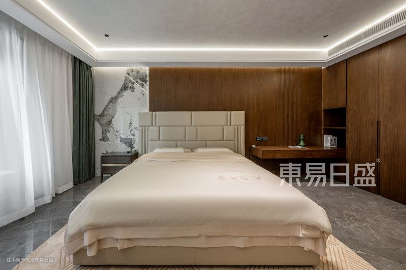 套房式的主卧空间是业主的私属领地,设计师在改造中充分考虑了居住者的生活习惯和需求。通过完善的生活系统,最大限度提升了居住的舒适度。为了增加储物空间,设计师还在衣帽间区域增设了整墙的收纳柜。