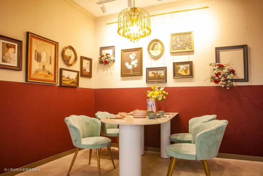 餐厅墙面下橘红,上白色拼接而成,挂画装饰,暖黄灯光,营造出一个温馨、浪漫的氛围。餐桌采用了白色的大理石材质,搭配黑色的椅子,显得简洁大气。餐厅的灯光采用了暖色的吊灯和壁灯,增加了空间的层次感和温馨感。餐厅的墙面上挂了一些现代风格的挂画,增添了一些艺术气息。