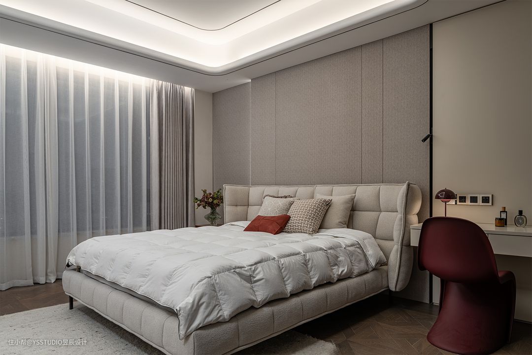 主卧回归恬静。在精装修原始的基础上,用素色的家具将空间简化,用留白姿态塑造淡泊之意。 唯二不多的点缀,恰是黑色石材塑造的台面及浓烈的红色梳妆凳。梳妆凳与花苞灯,择相同色系,优雅又内敛,充满了典雅的调性。 家具搭配清单list: 床:RECASA HOME 床边柜:USM 梳妆椅:Vitra Panton