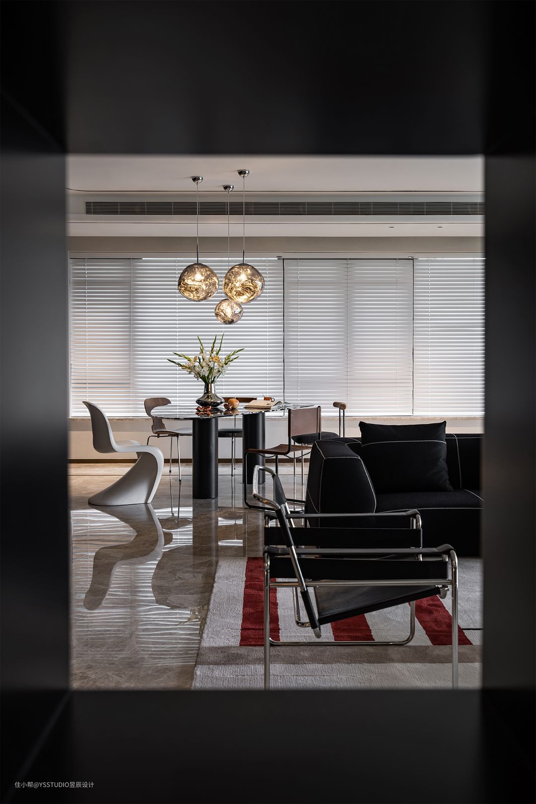 被熔岩灯照亮的这一刻,动人心弦 空间的墙体、地面均以浅色为主,从色彩分析而言,务必需要一点浓墨重彩去平衡空间的色彩关系。其二,包豪斯与生俱来一种黑色的秩序感,我们在餐厅的角落里,以不同层次的黑,突出空间的风格与特点。 没有选择传统的圆形或是长条形餐桌,一张极具设计感的三角形餐桌,并用黑色宝格丽奢石的天然纹理铺以台面,台面的轻微反光,折射出百叶的光影,释义空间的美。 餐边运用了胡桃木材质作为柜体,打造了一个温暖氛围的水吧台,实用且触感舒适。柜体与具有设计感的单椅相互呼应,将深浅不一的木质带来的复古感刻画得入木三分。 家具搭配清单list: 餐桌:RECASA HOME 餐椅:吱音/蚂蚁椅/United Stranger 餐厅吊灯:Tom Dixon