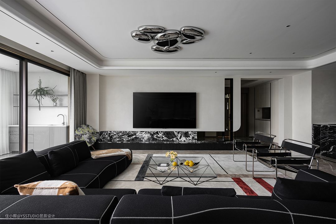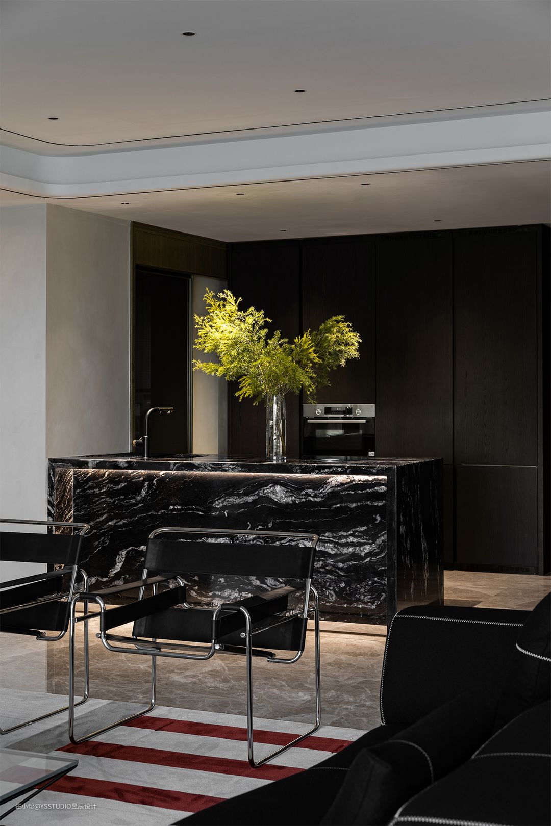 客餐厅保留了原始的地面,但通过地毯的铺设,并结合空间的装饰,柔和了整体的现代风格,也弱化了地面边线带来的突兀感和强烈的光感。 主沙发来自B&B Bend,带有曲线之美,流畅的外缝线勾勒了每一处精致。茶几同样选择了极简的线条,简化的元素、排列与组合,构成了包豪斯的艺术,也为空间带来一种高级克制的美感。 宇宙金-细密且自带的微微光感,更突显家的气质。 金属质地的家居单品在空间中得到最大的释放,黑色石材做点缀之彩。重新定制的岛台在选择材料的时候,采用了同样是黑色,但纹理更为浑厚的「宇宙金」,犹如一条流动的银河。 家具搭配清单list: 沙发:B&B. BEND