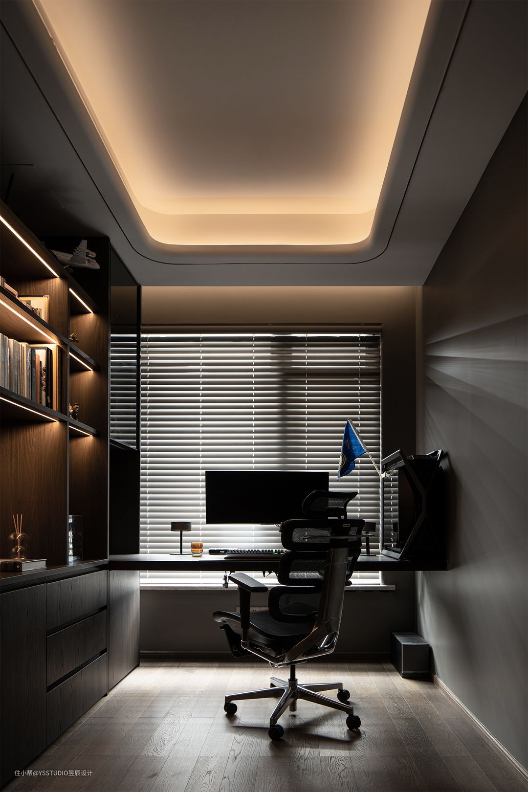 相比传统的书房,一个极简式样、具有科技感的电竞房更符合男主人的需求。无主灯的设计,深色的饰面、氛围感的线性灯及窗边百叶,相互碰撞将线条的排列组合拉满,给予更放松的精神空间。