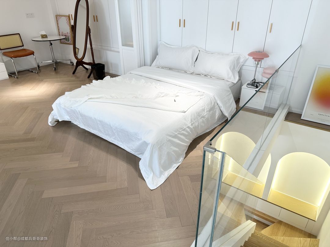 ❤本套案例位于成都市·成华区·弘创名座,建筑面积60m²,套内面积41m²,层高4.9米,是一套长宽皆为6米多的loft公寓。屋主是90后小姐姐,公寓装修出来打算自己住,要求保留两个卧室,能够有看电影的功能空间,一楼至少保留一面全景落地窗,比较注重室内空间感,喜欢田园风、美式风、简约风,不拘束于特定的哪种风格,只要让空间一眼看上去就心动就行~~ ❤设计师根据业主小姐姐的要求,给出以下几点建议哦~~ 1.钢结构阁楼:建议保留1/4挑空,让落地窗的光景很好地映入室内,空间采光、通风也会很好; 2.楼梯:楼梯选择最不占空间的形式——U形楼梯,占地面积仅需1.5米*1.5米,楼梯下方还可以储物,很实用的一款楼梯哦; 3.空间布局:3/4的空间用来隔层搭建,一楼是客餐厨卫,二楼是两个卧室,功能布局适合自住,品质会很好; 4.风格:综合了田园风、美式风、简约风元素,混搭装修设计。 💕接下来一起看看每个空间的美丽样子吧~~