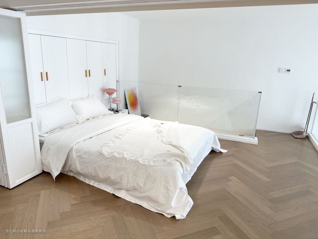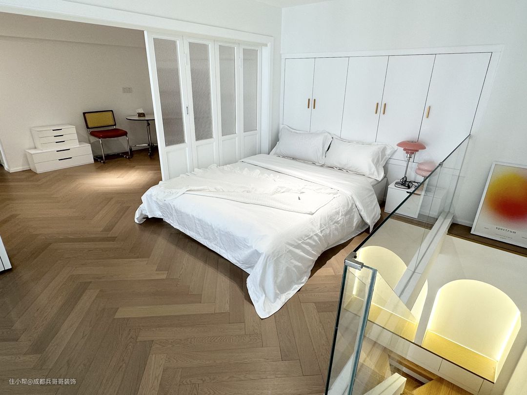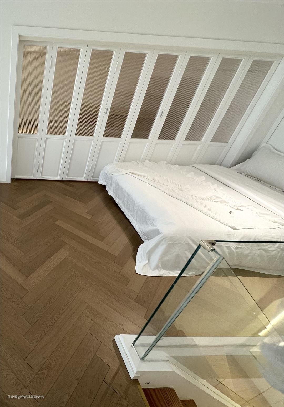 次卧室,再二楼上楼后的旁边空间,放置了一米八的大床,床头还安装了一整排的嵌入式衣柜,巧妙利用有限的空间,侧边呢是田园风的推拉门,满满的设计感,很赞~~