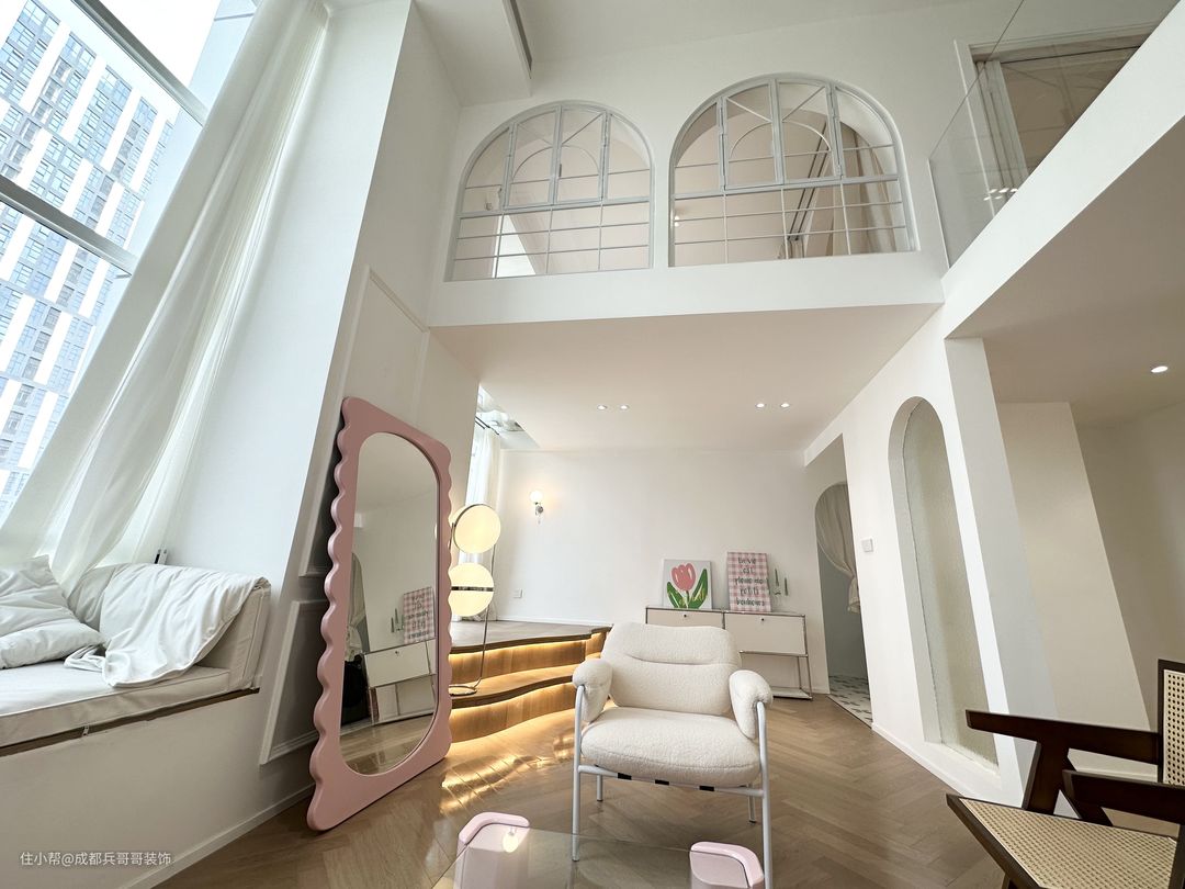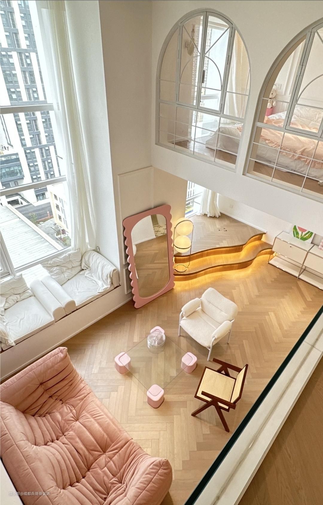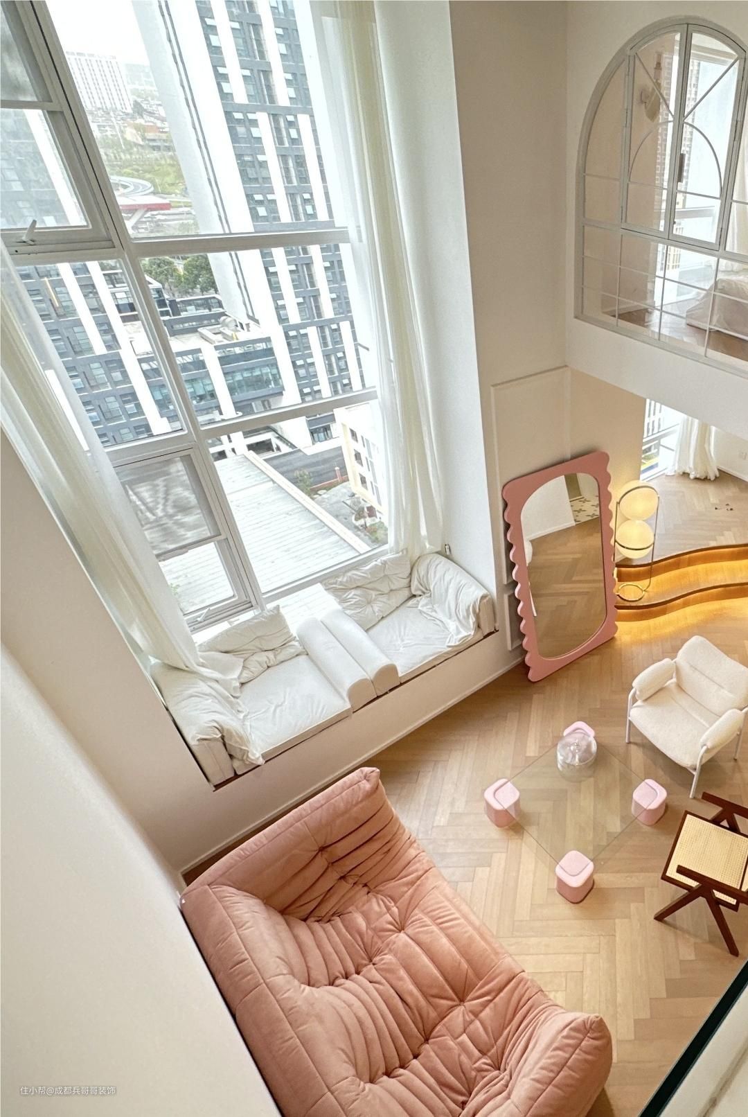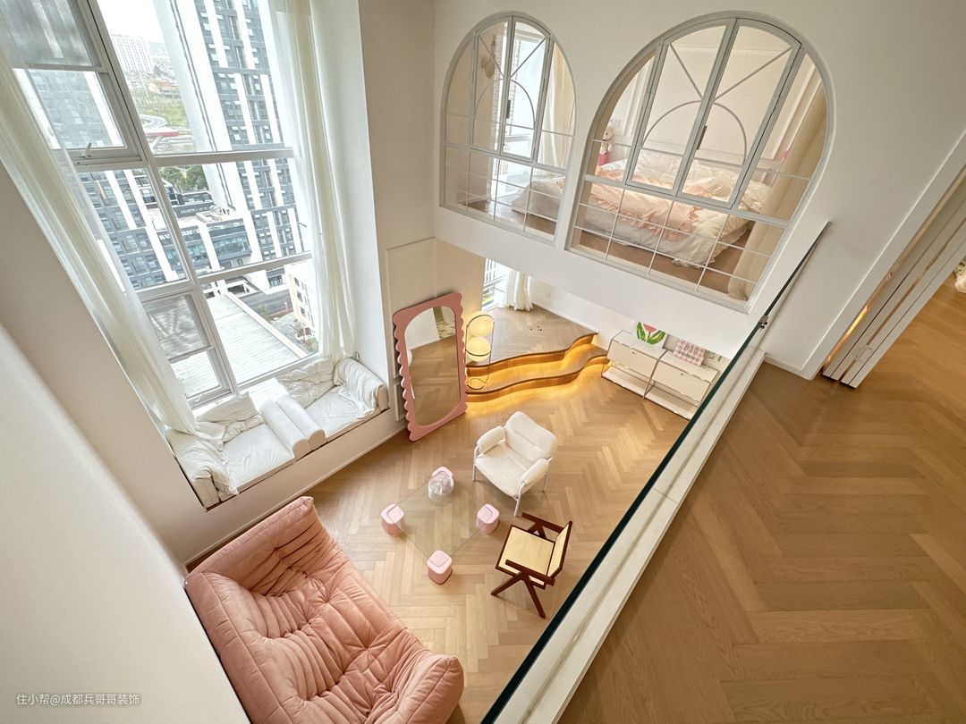 客厅,挑空4米多的高度,再一楼靠窗区域,拥有一半的面积享有客厅空间,没有束缚感,尽情感受设计带来的自由感~ 挑空飘窗台放置了两个休闲沙发,闲暇时刻还可以和朋友一起聊天、看看风景,很惬意~ 阁楼下方的飘窗台做楼楼梯阶梯式休闲区,也可以当做一个小舞台,和好友在这里聚会唱歌、表白很有氛围感~