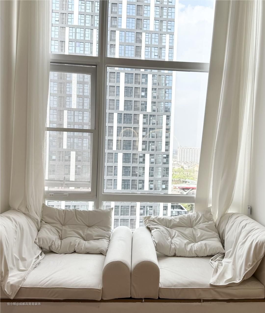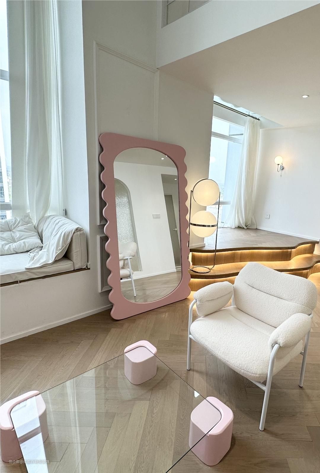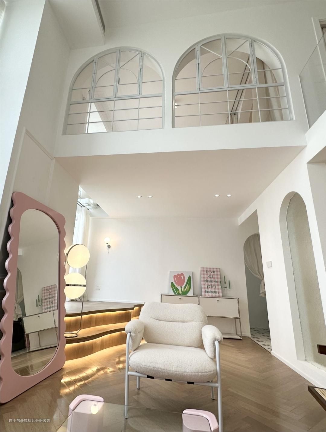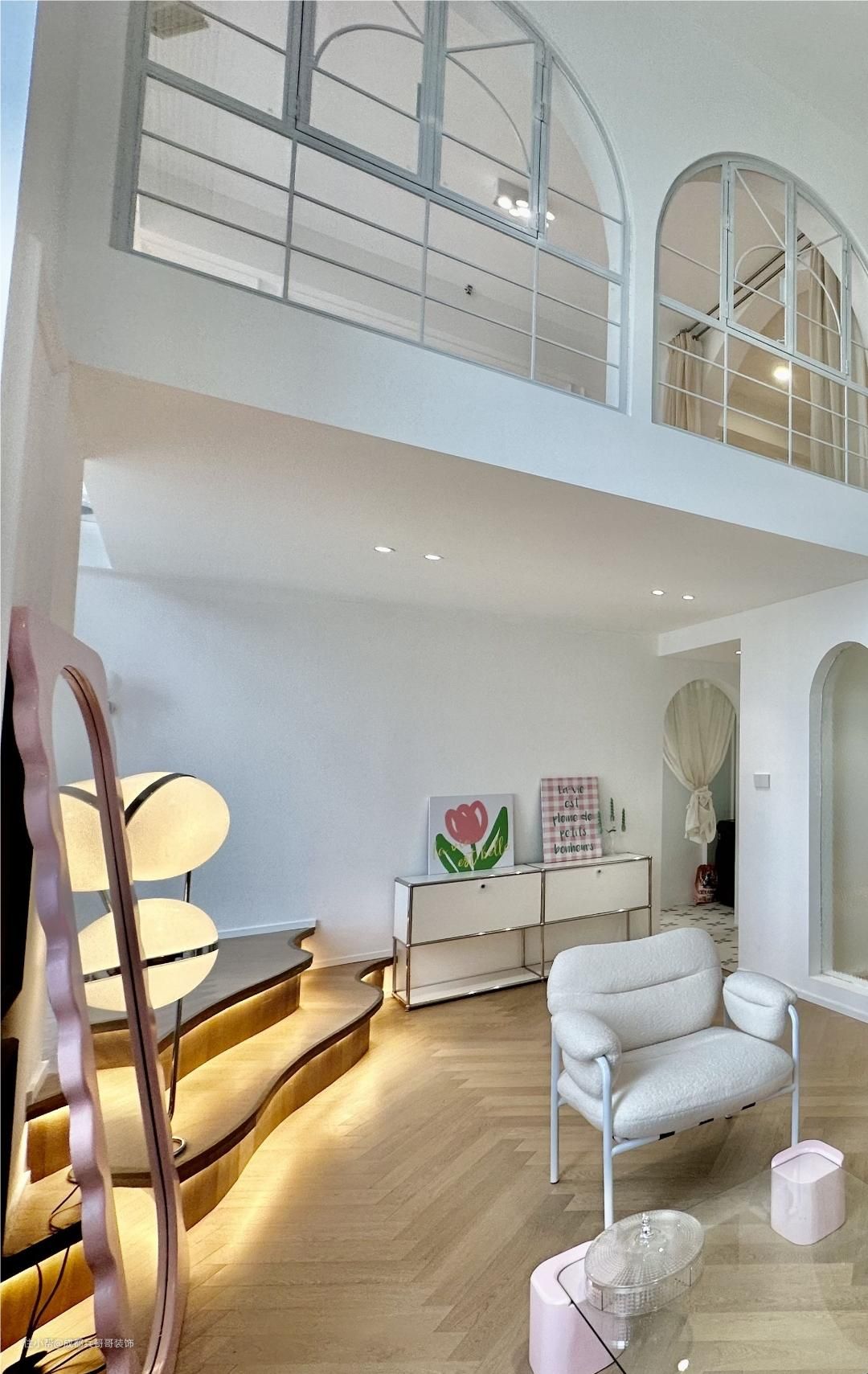 客厅,挑空4米多的高度,再一楼靠窗区域,拥有一半的面积享有客厅空间,没有束缚感,尽情感受设计带来的自由感~ 挑空飘窗台放置了两个休闲沙发,闲暇时刻还可以和朋友一起聊天、看看风景,很惬意~ 阁楼下方的飘窗台做楼楼梯阶梯式休闲区,也可以当做一个小舞台,和好友在这里聚会唱歌、表白很有氛围感~