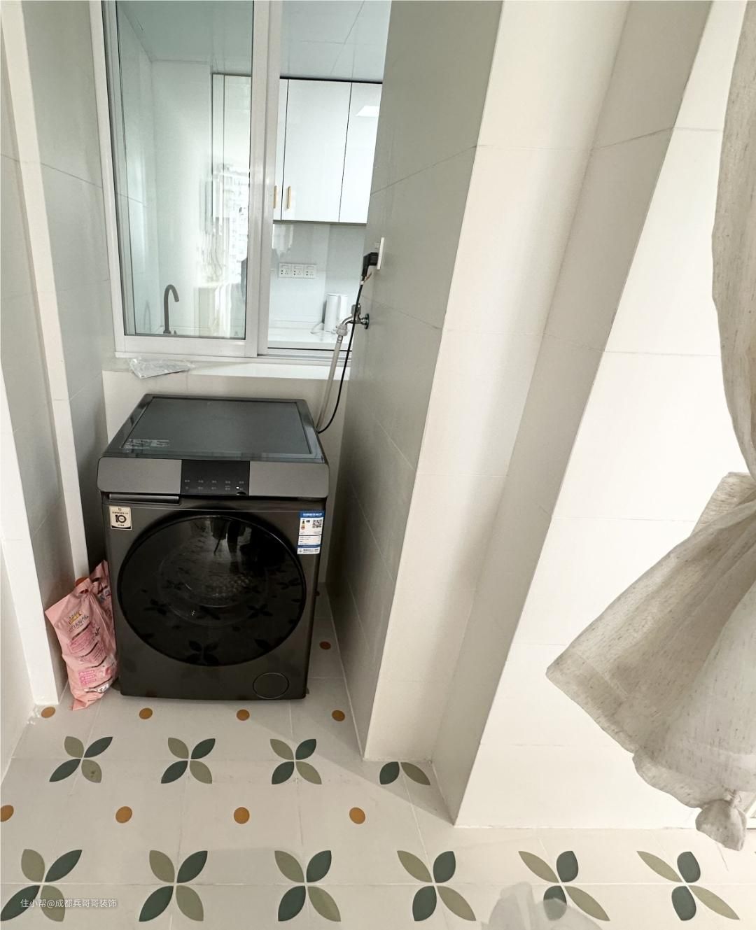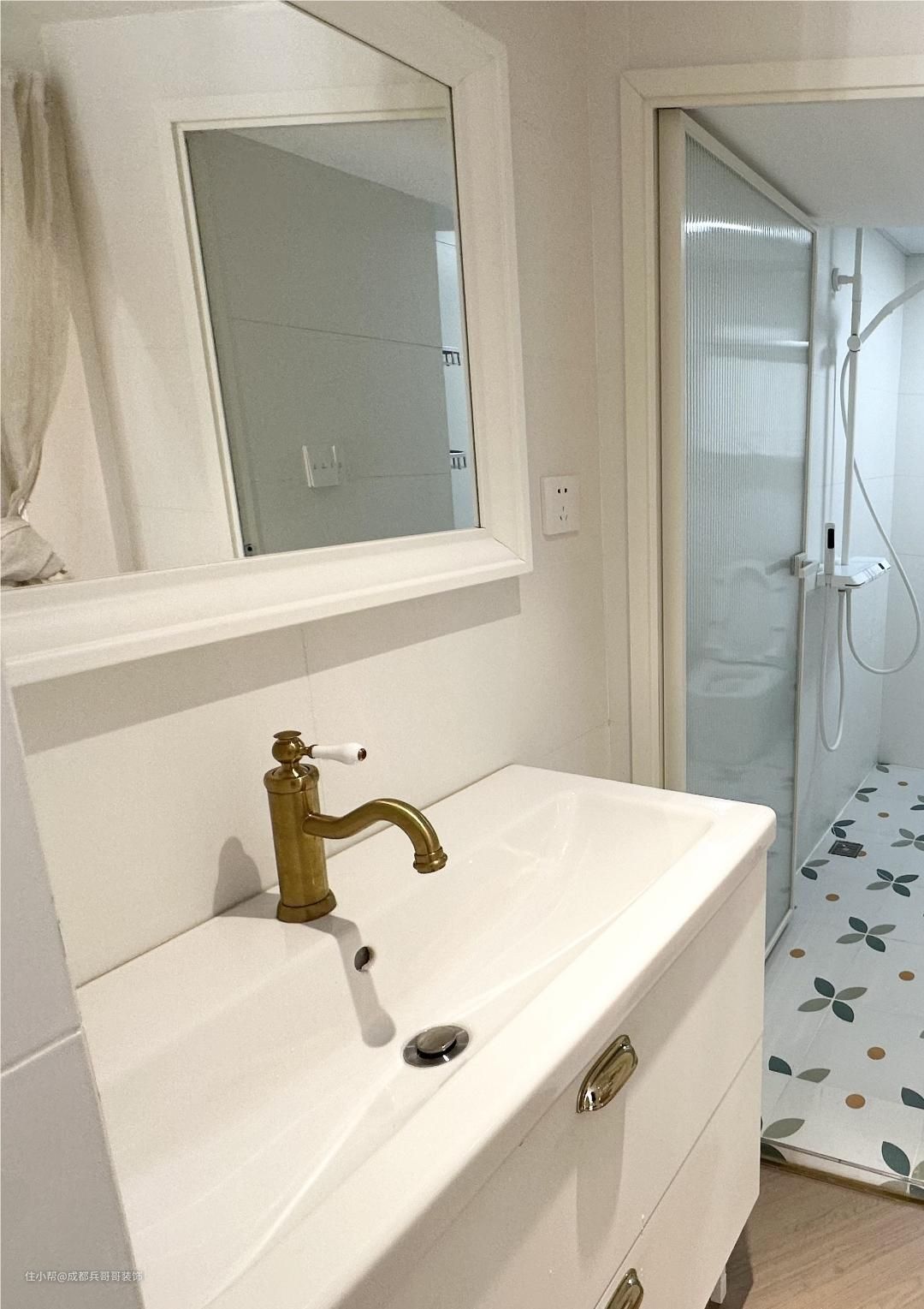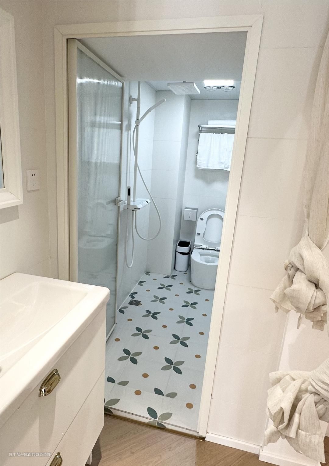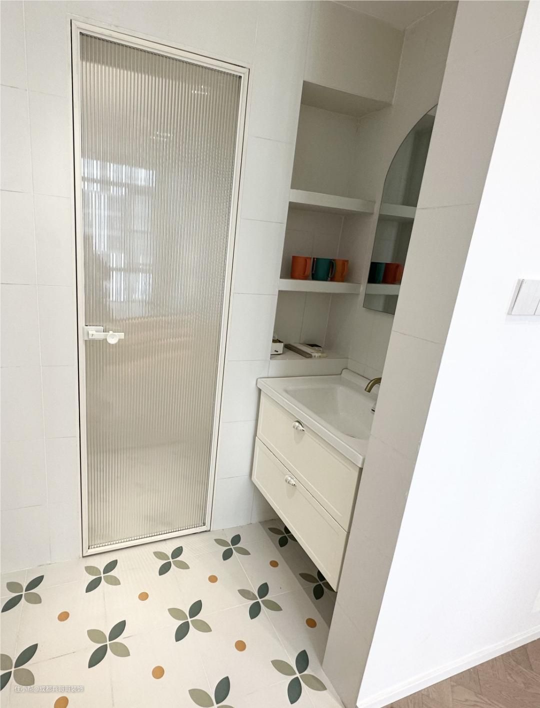 卫生间在一楼,浴室柜在外面,马桶区和淋浴区在里面,二分离设计,日常也方便清洁打扫。墙砖、地砖满铺,防水防潮效果更好,整体是简约风格,十分干净美观~~