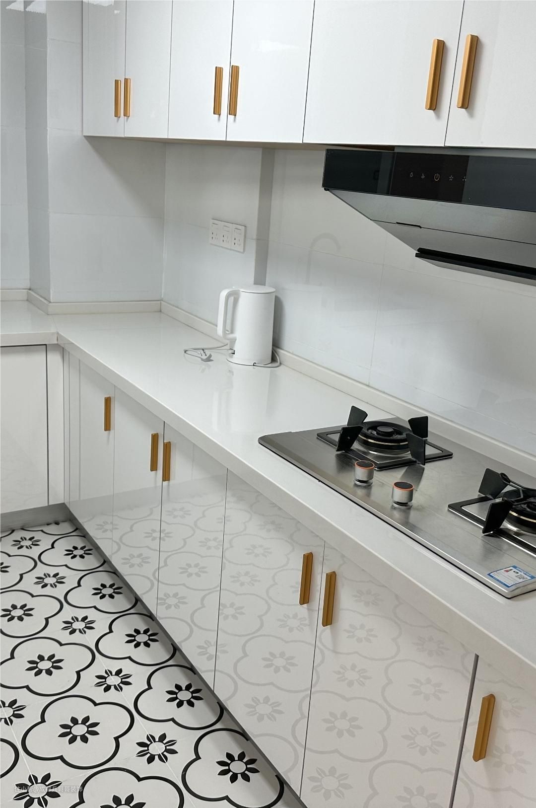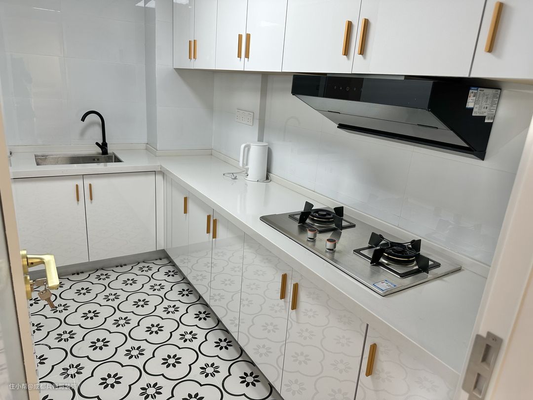 厨房,L形设计,一整排吊柜和地柜,储物功能相当足够,中间便是做饭、洗菜的区域,满足基本使用功能,还不错~~
