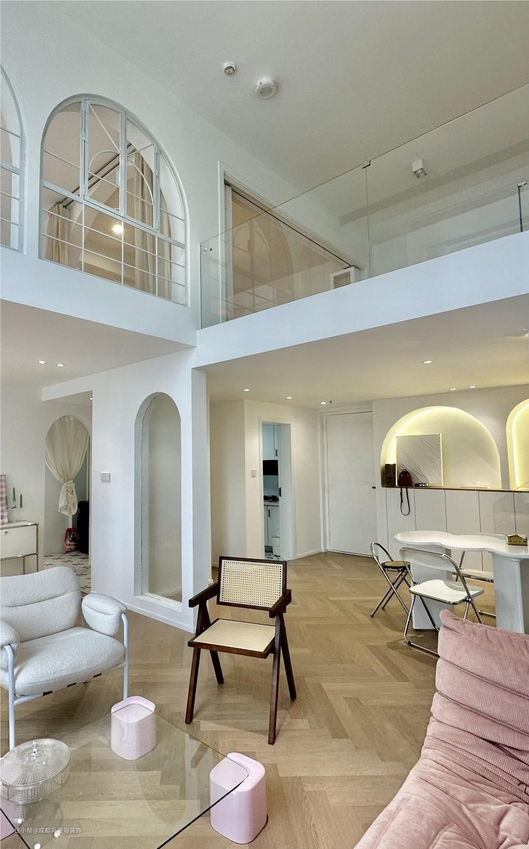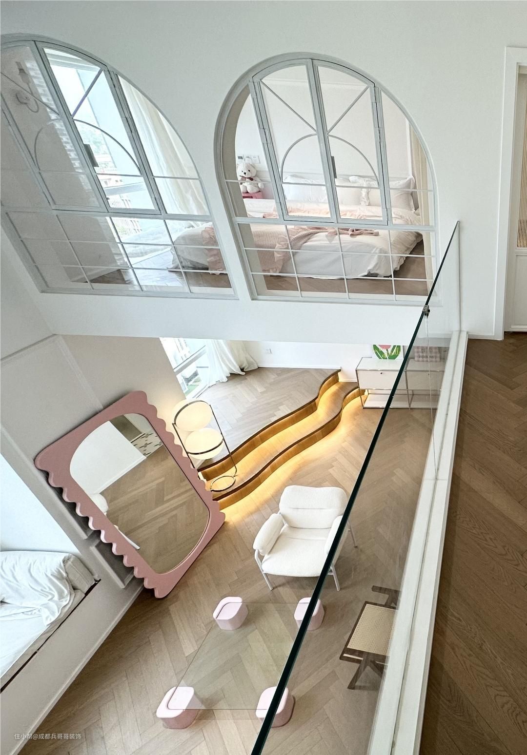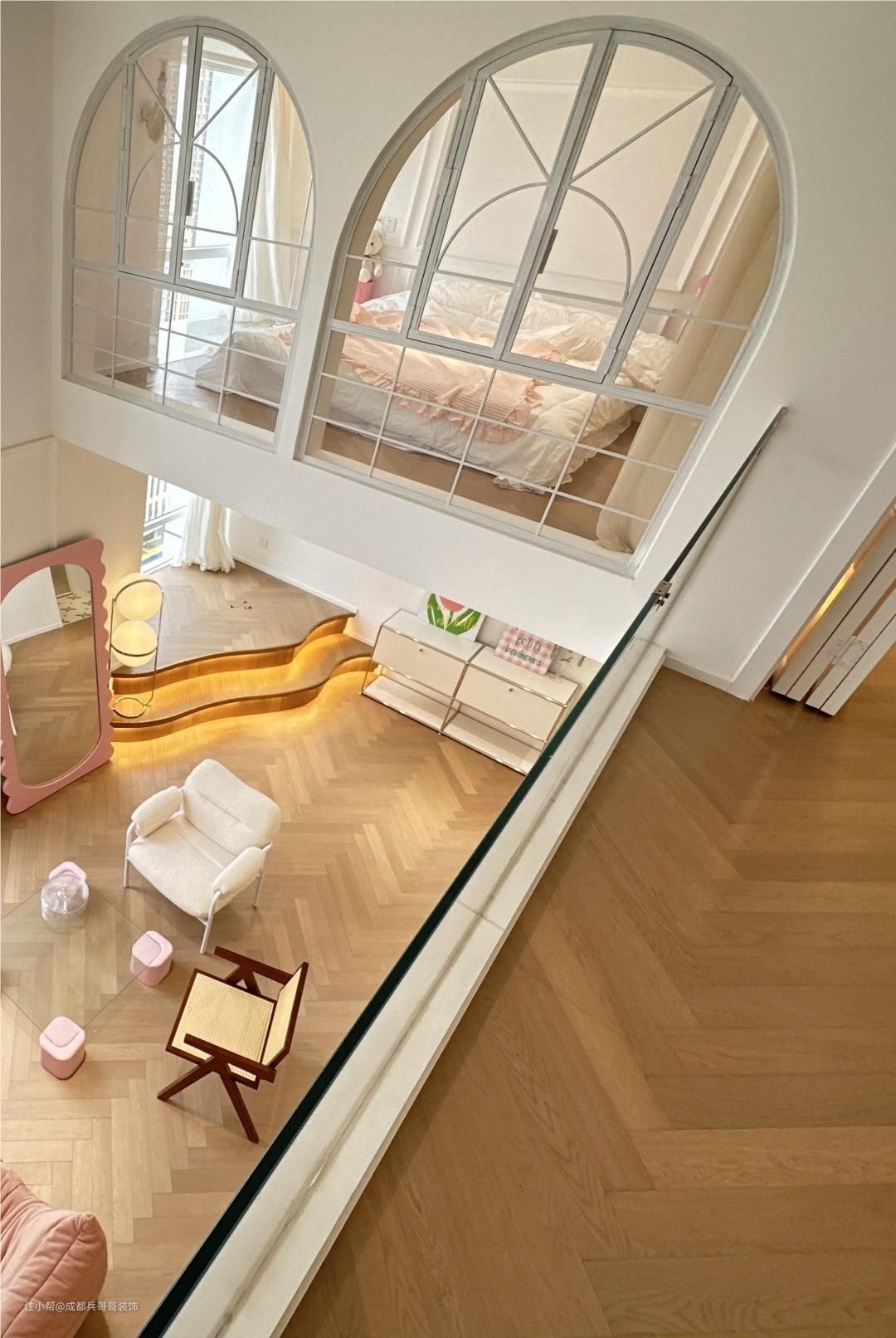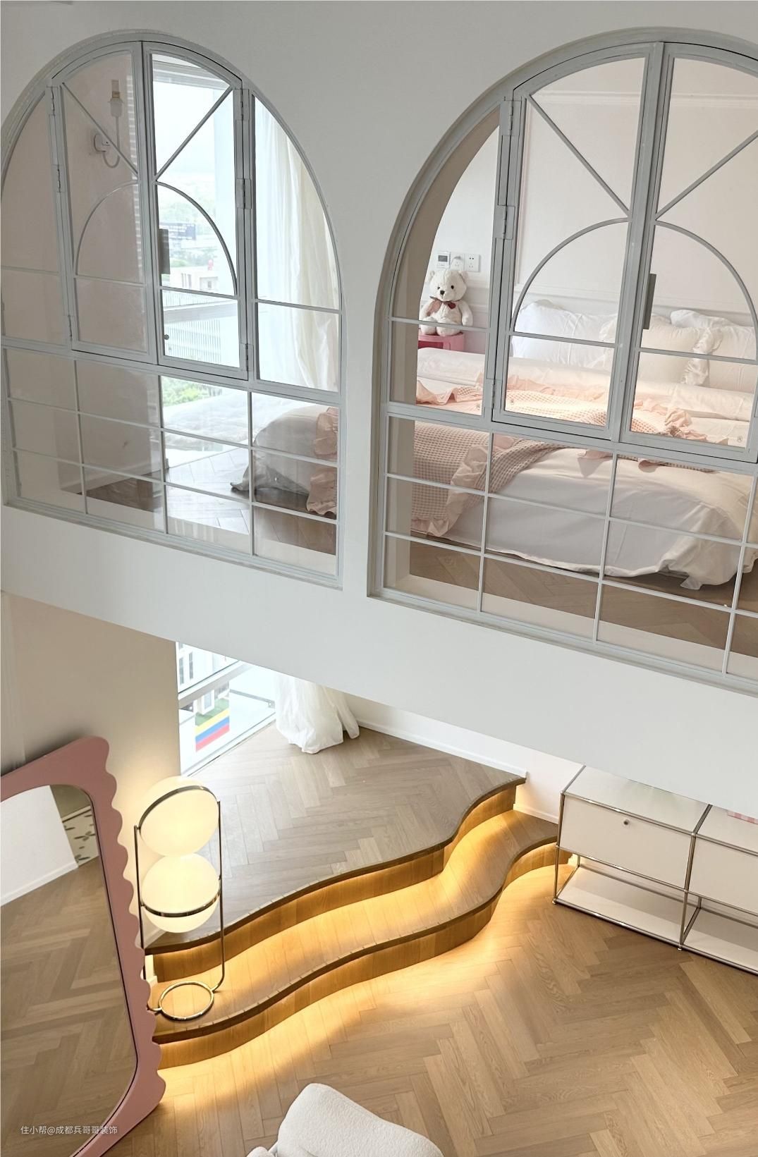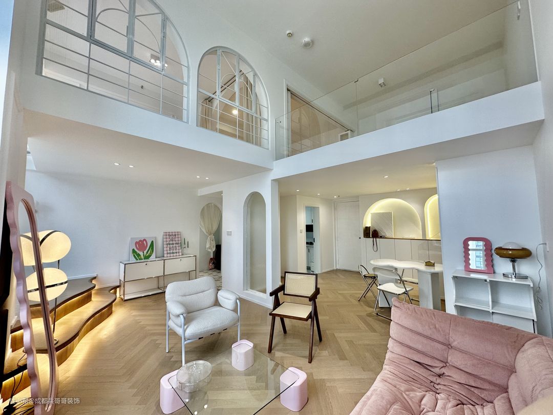 这套loft公寓钢结构搭建出了两层楼,室内一点都不压抑,很多拱形门洞设计在空间里,个性化的造型彰显出屋主的独特品味。二楼侧边没有选择砌墙,而是半高的无框玻璃扶手,空间通透感更好,整个视野感也超舒适。无论哪一个角度拍照、参观,都十分好看,很美~~ 整体的色彩设计呢,是奶油白、原木色作为这套公寓的主打色彩,简约又十分耐看。设计师保留户型优势,以现代风格融汇空间与软装的关系,混搭流行元素,给予居住者最大的满足感~~