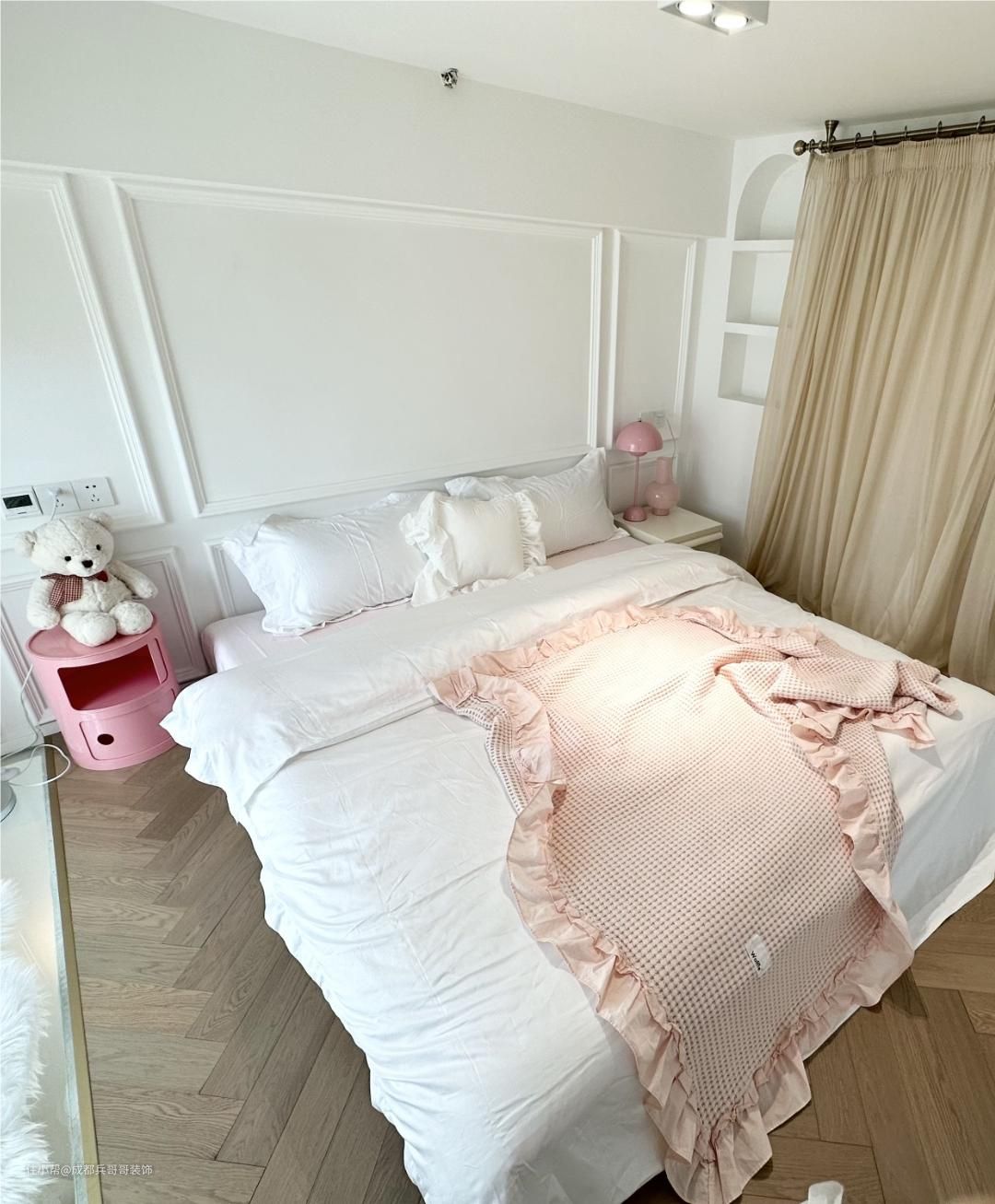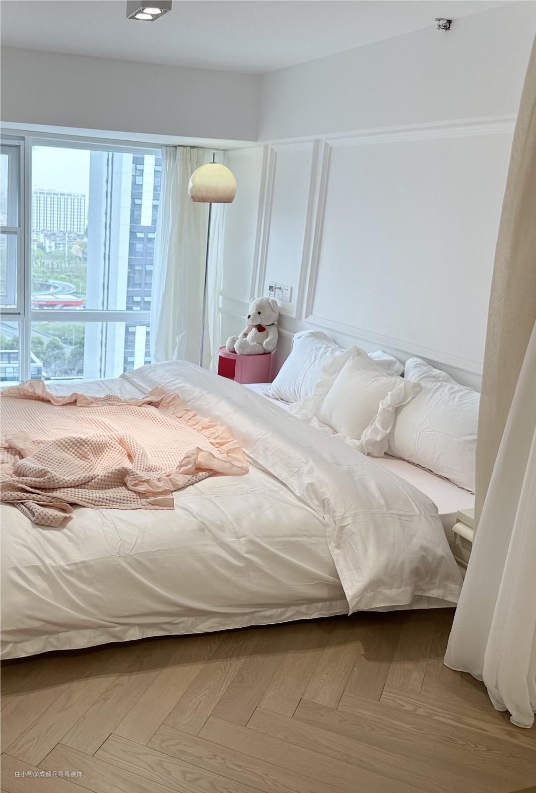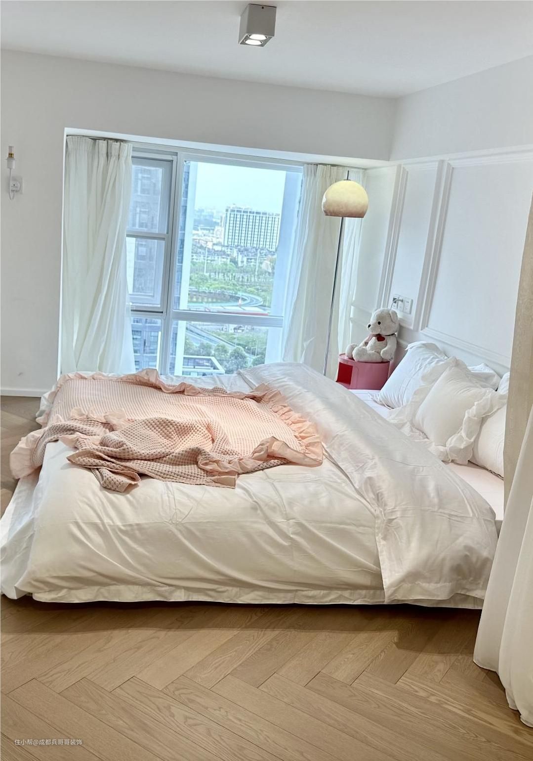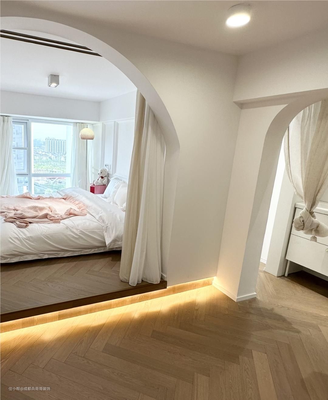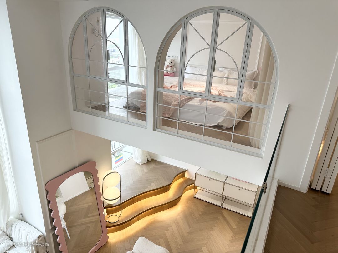 主卧室,再二楼靠窗的位置,卧室侧边供应门洞设计,另一个侧边是拱形门窗的设计,床头背景墙还设计了个性化造型。拱形门洞地台还镶嵌了氛围灯带,让空间感更浪漫温馨,让人一眼便很喜欢这里~
