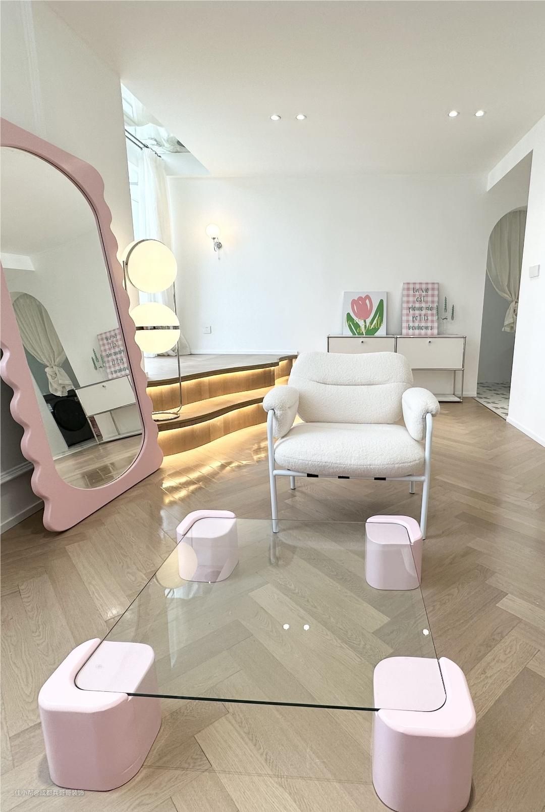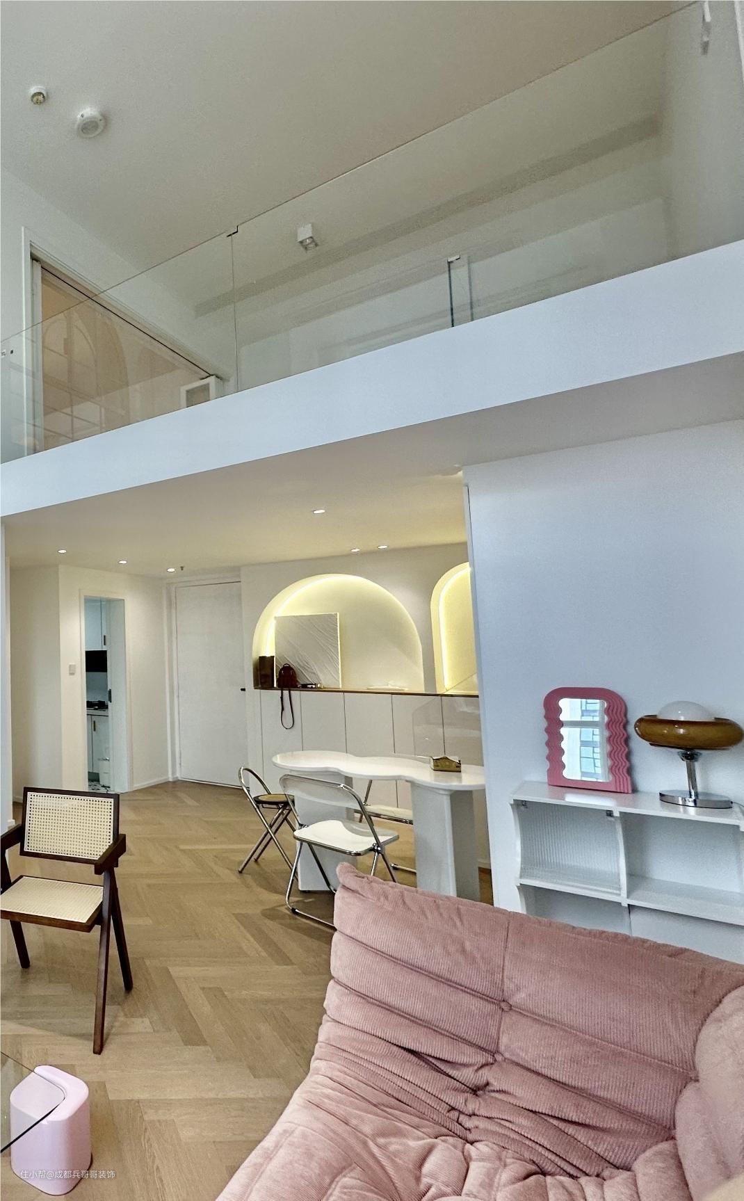 ❤本套案例位于成都市·成华区·弘创名座,建筑面积60m²,套内面积41m²,层高4.9米,是一套长宽皆为6米多的loft公寓。屋主是90后小姐姐,公寓装修出来打算自己住,要求保留两个卧室,能够有看电影的功能空间,一楼至少保留一面全景落地窗,比较注重室内空间感,喜欢田园风、美式风、简约风,不拘束于特定的哪种风格,只要让空间一眼看上去就心动就行~~ ❤设计师根据业主小姐姐的要求,给出以下几点建议哦~~ 1.钢结构阁楼:建议保留1/4挑空,让落地窗的光景很好地映入室内,空间采光、通风也会很好; 2.楼梯:楼梯选择最不占空间的形式——U形楼梯,占地面积仅需1.5米*1.5米,楼梯下方还可以储物,很实用的一款楼梯哦; 3.空间布局:3/4的空间用来隔层搭建,一楼是客餐厨卫,二楼是两个卧室,功能布局适合自住,品质会很好; 4.风格:综合了田园风、美式风、简约风元素,混搭装修设计。 💕接下来一起看看每个空间的美丽样子吧~~