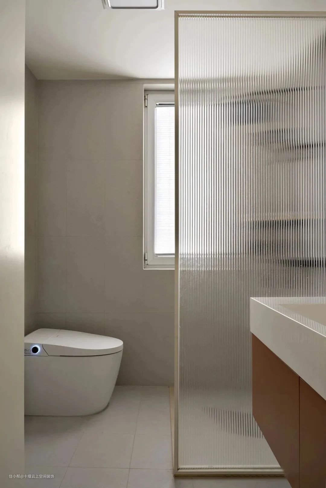 卫生间一体式台盆设计。淋浴区采用长虹玻璃门做隔断,不影响采光,保证室内通透性。