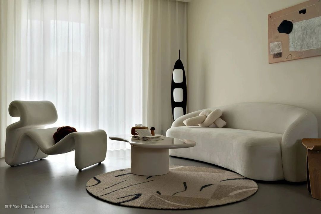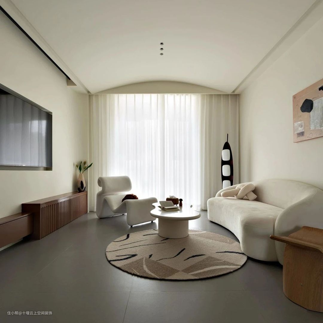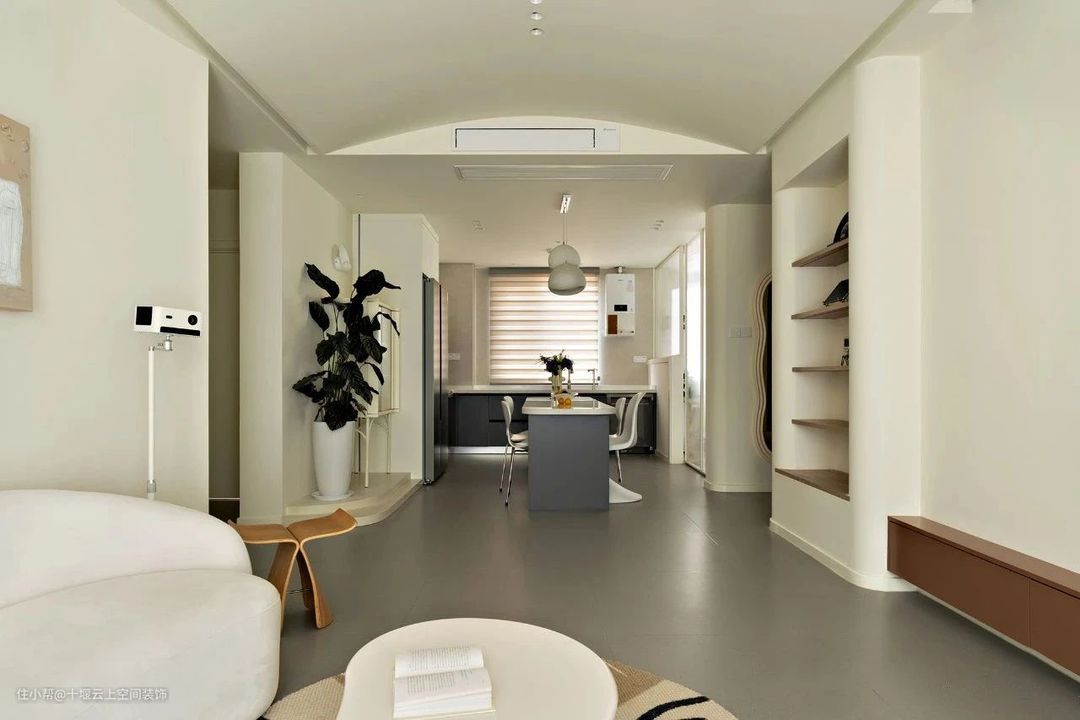 客厅全景,整个空间使用奶油色调,奠定柔和治愈的主基调。顶面做拱形穹顶设计,打破传统,别具独特韵味,创造一个干净空灵的空间。
