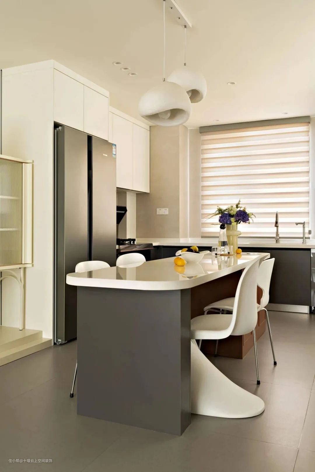 从客厅看向餐厨视角。将厨房完全打通后,实现全开放式格局,开阔大气。灰色地砖在公区一路通铺,保证视觉上的整体与统一。定制岛台+餐桌一体设计,形成清晰的洄游动线,充当厨房的备餐区。