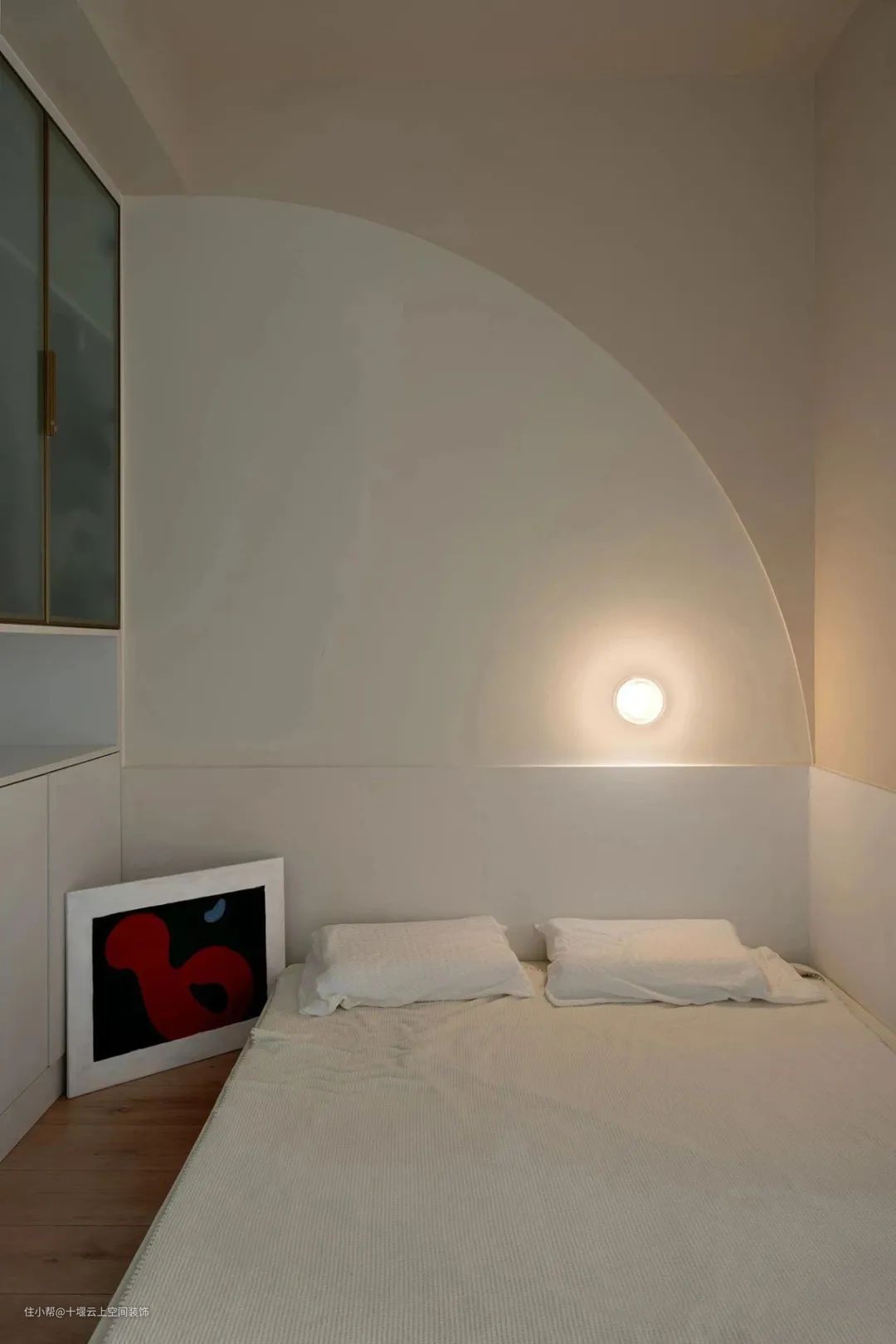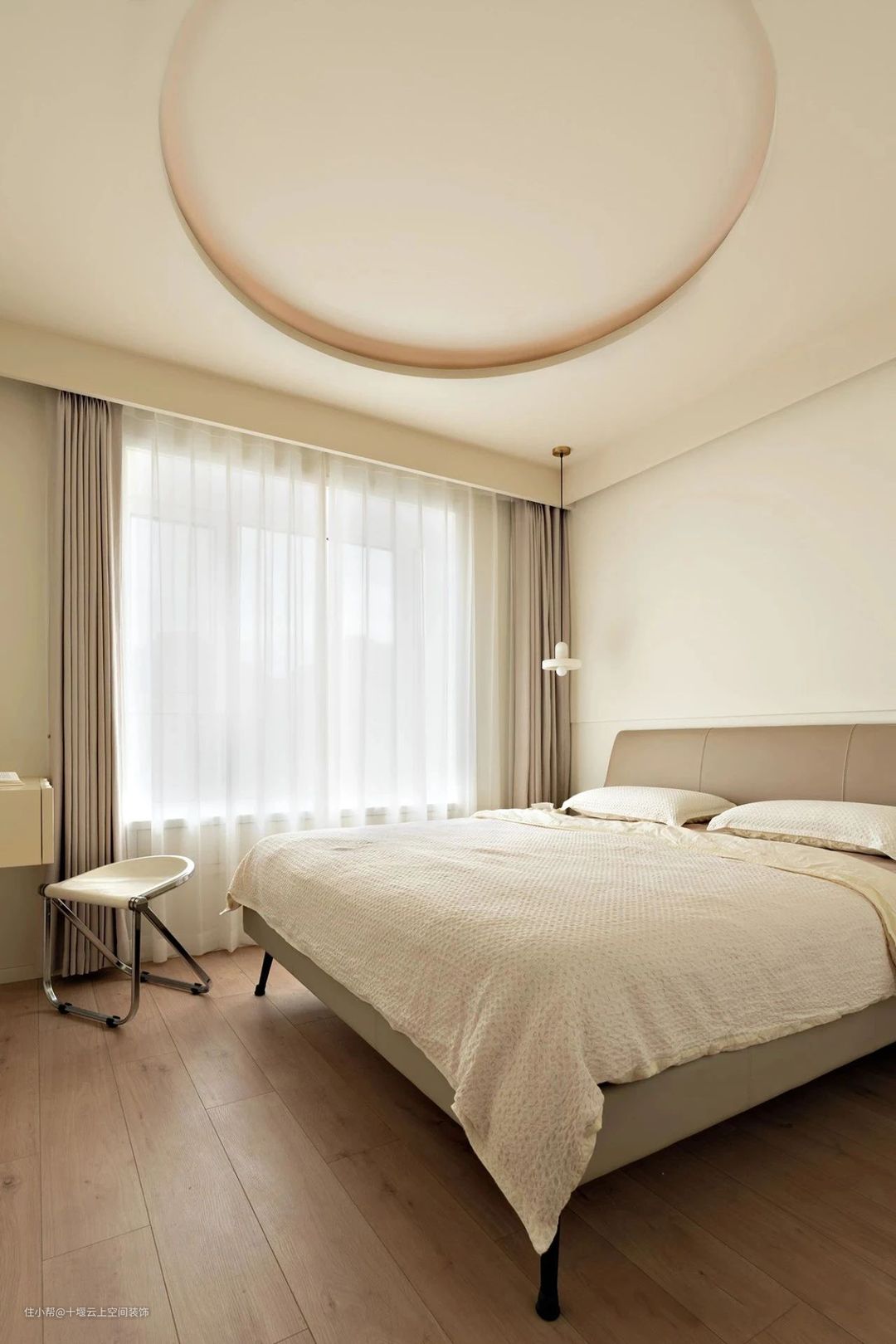 主卧,依然沿用奶油色调,地面铺以木地板,营造温润轻盈的氛围和意境。顶面设计圆形吊顶,增添空间层次,显得更有气质与韵味。