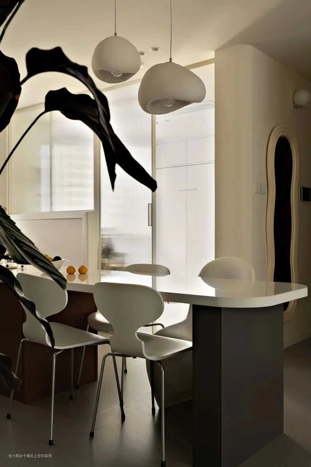 清冷的灰白色调餐桌椅搭配艺术吊灯,构建舒适的用餐环境。