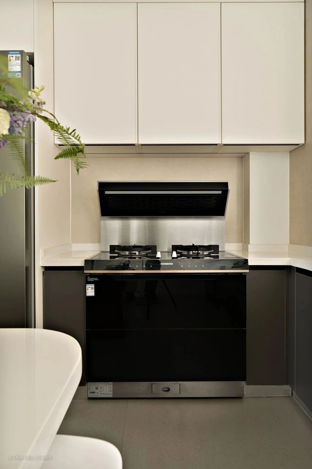 开放式厨房设计,经典黑白用色,清冷不失温柔。遵循上浅下深搭配原则,营造舒适耐看的烹饪氛围,白色操作台干净简洁,落落大方。