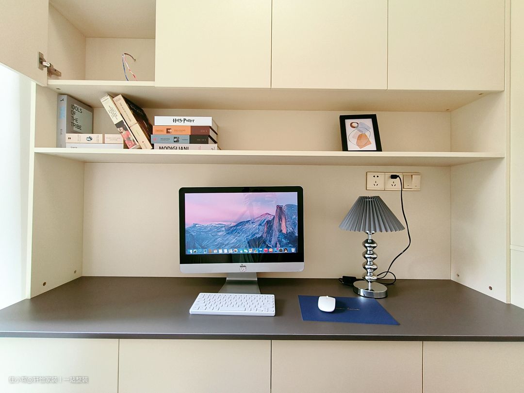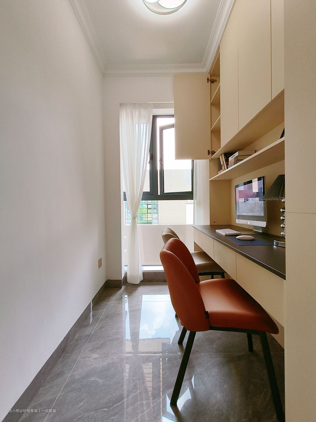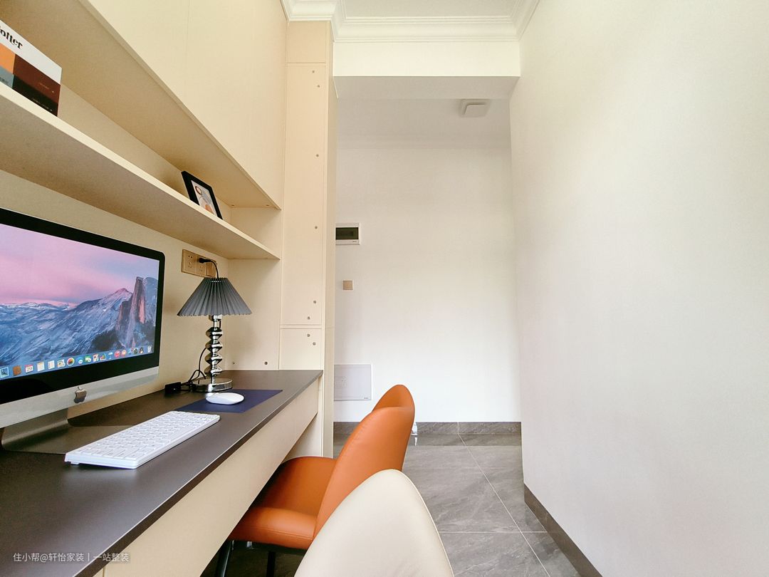 书房以简洁实用为核心,主体包括书桌、台灯、装饰画此外,侧边大面积落地窗引入了充足的自然光源,使书房充分满足办公、阅读等需求。 橘色和奶白色椅子,舒适靠背,全方位承托,放松身心。宽大实木储物抽屉,进口落叶松实木打造大容量储物空间,可分类存放物品,有序整洁收纳.纹路细致,结构均匀,呈现清新雅致的自然气息。 书桌书架一体化设计,海量储物,兼备储物和实用性,一步收纳也到位,从上到下都有舒适体验,随手取用的书籍往上放,桌下的抽屉还能用来囤货,怎么用都舒心。