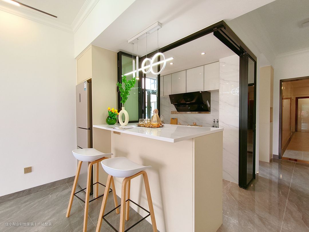 餐厅吧台合二为一,全岩板厨房吧台,以精致重塑家的气。高品质岩板,一面科技,一面艺术,轻松拥有看书品酒的地方,三平方的小角落,不管是工作还是放空,都特别轻松惬意,将厨房与客厅分隔开,有效增加空间通透感。开放式布局欢聚共享下厨时光,视野开阔便于聊天互动,亲朋好友轰趴欢聚更亲密无间。 创意吊灯,高颜值造型,线条简约流畅,营造温馨舒适氛围。 嵌入式冰箱设计,合理利用空间。