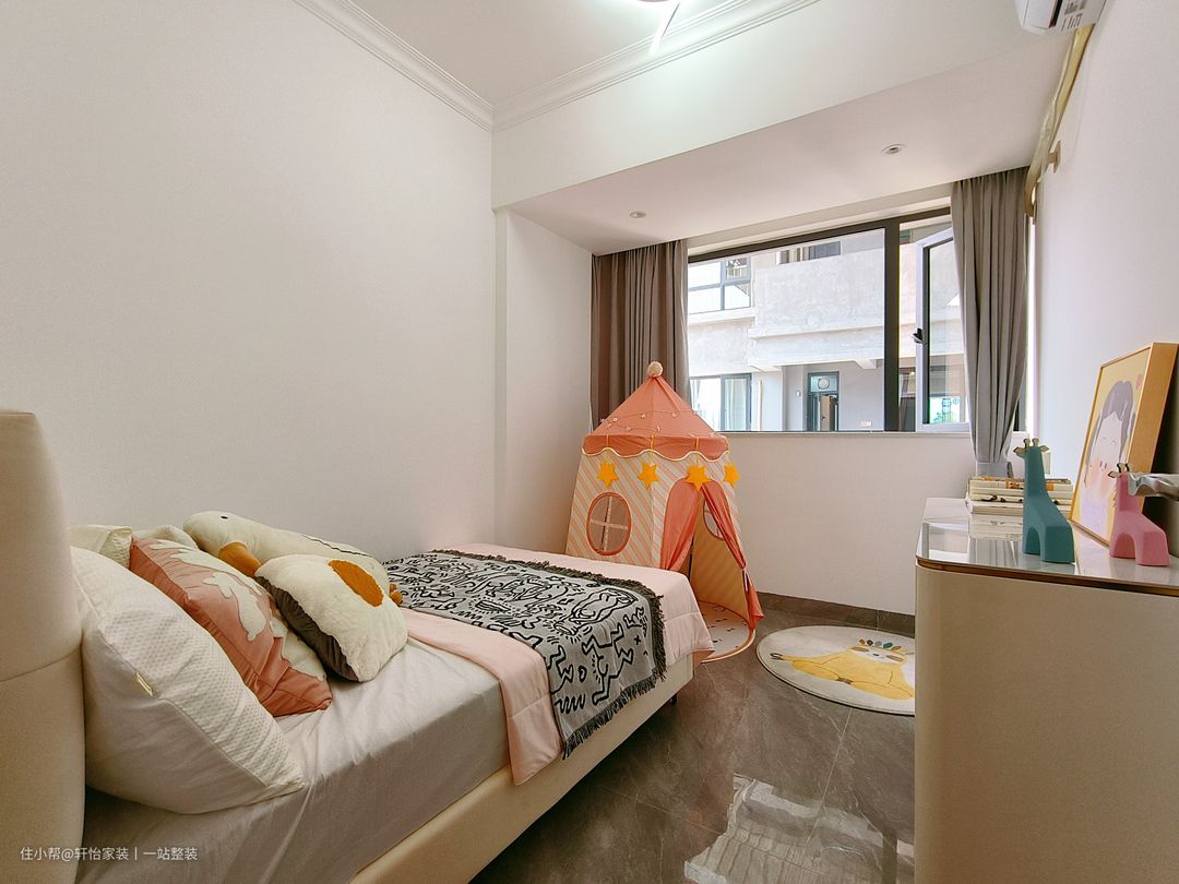 儿童房设计更显活泼。木饰面半墙设计,搭配柔色墙画,注入艺术气息的同时,柔化空间气质。奶白色储物柜紧贴墙壁摆放,配上饰画、小摆件,给人以精致优雅之感,培养孩子收纳物品的好习惯。 儿童房为小朋友创造一个舒适的居住环境,以卡通为主题,床位放置粉色小帐篷,宝贝的奇幻乐园城堡,创造属于孩子的私密空间,帐篷虽小,爱很大,与孩子一起探索成长的奥秘。在孩子眼里,它是城堡、是秘密基地是公主的化妆间、是娃娃下午茶时间,儿童美学设计,材质透气有机,搭配ins风圆形棉垫,安全呵护孩子安全。 床上放置可爱的抱枕,细腻亲肤,嫩粉色床单,营造梦幻般的美感。床的框架选用实木条强力支撑,稳固坚实,保护孩子爱蹦跳的天性。