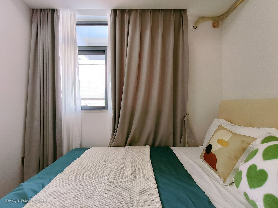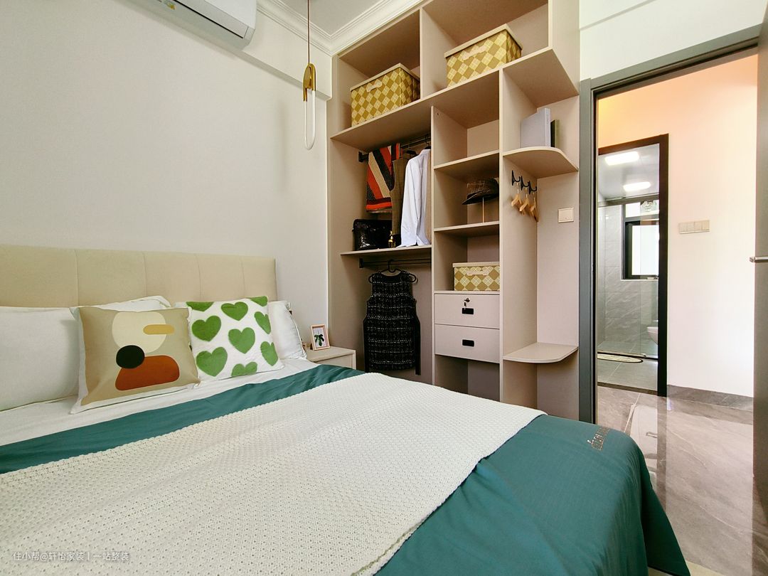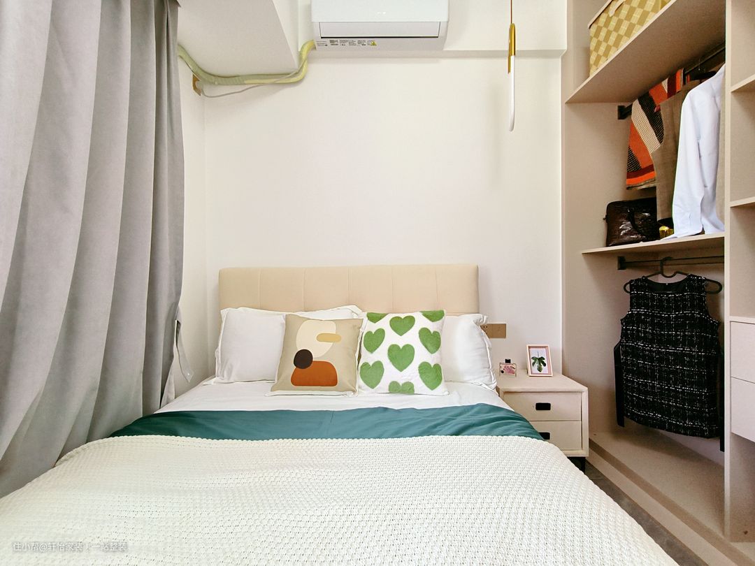次卧整体色调保持着一致性,右侧奶白色的床头柜,营造温馨的氛围。次卧同样选用开放式衣柜,便于挑选衣物。衣柜里左侧设计亦适宜妥善存储长裙和大衣,另一边的开放格放置包包和饰品,带来更强烈的陈设美感。靠窗的设计,自然而然地把温暖旭日带了进来。 绿色爱心抱枕,花色清晰可爱。