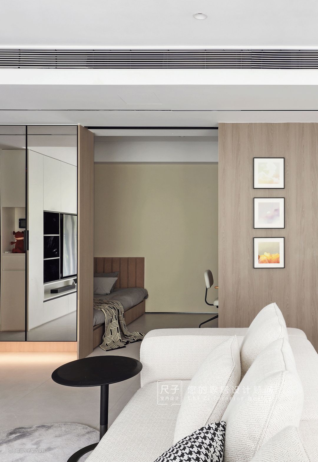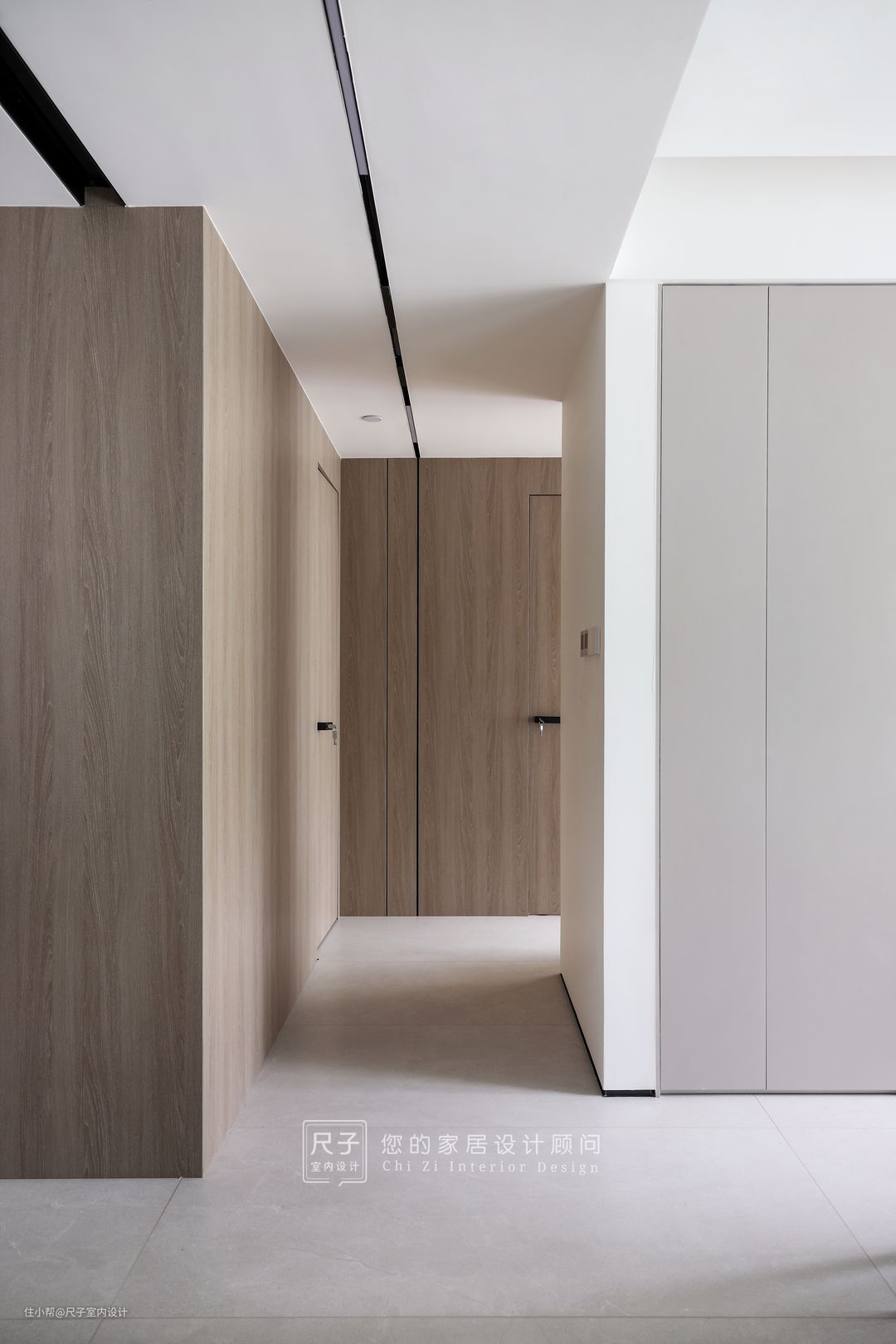 进门顶部的线性灯有延伸视觉的既视感;以白为主木为辅的空间,渲染出安静的氛围,形构的立体层次发挥横平竖直的线性力量,错落之间又有材质质感对比,秩序与变化共存,横厅空间越显宽敞。