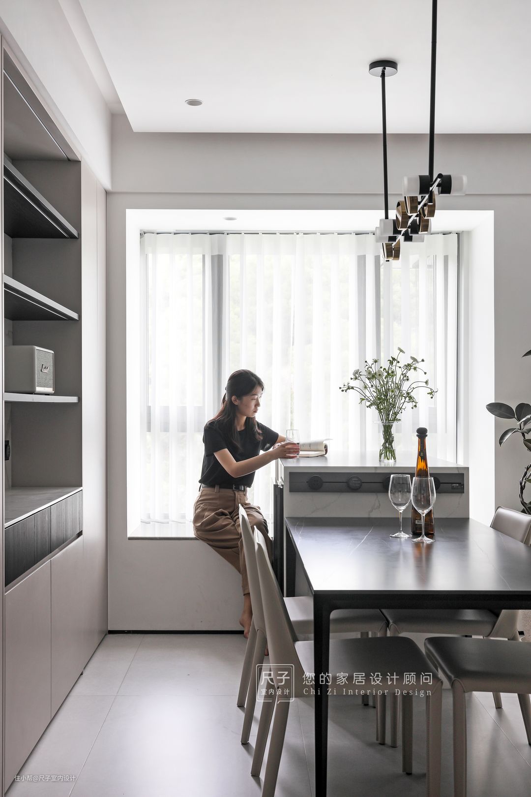 餐厅布局极具巧思,将水吧台与飘窗结合,岩板与吊灯金属增添质感,借插花技艺进行点缀,迸发出清新活力,自然亲切回归慢生活,作为享受美食的惬意之地。