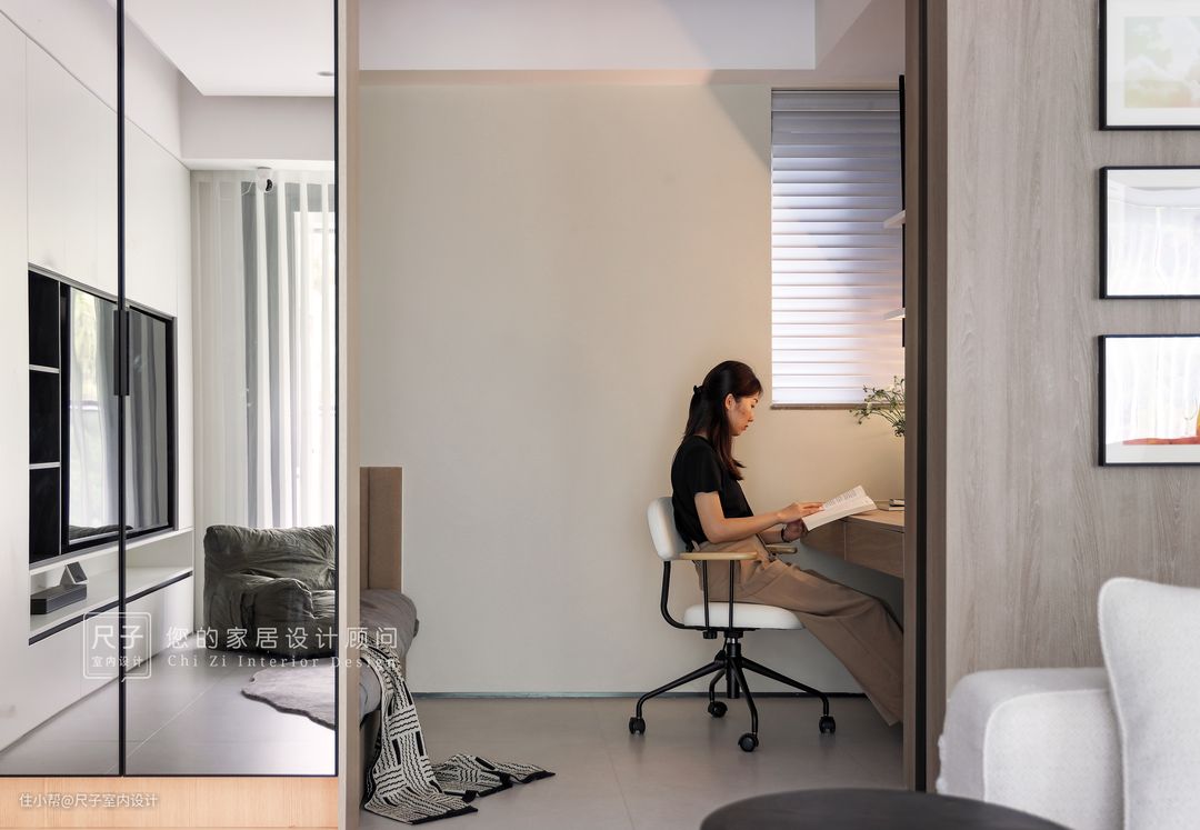 书房将阅读工作、休闲时光一概框入,在口袋门和柜镜的设计下,有效弱化了空间界限,整体统一。