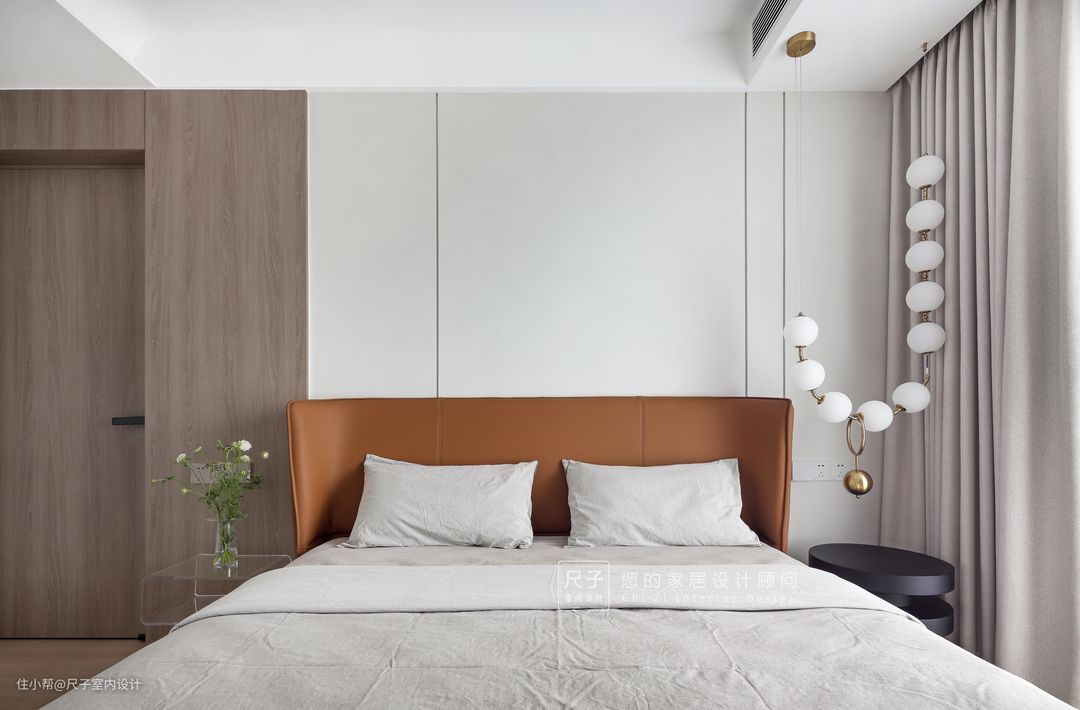 主卧白+木呼应主空间,干净温馨的氛围点缀爱马仕橙,与古铜色金属凸显立体感,不动声色的增添精致格调。