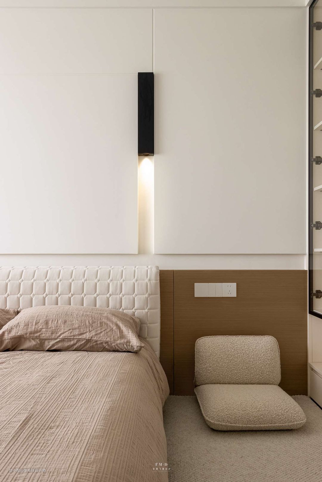 背景墙采用斯卡帕叠层设计,底部搭配木饰面墙裙,丰富背景墙整体层次感;石膏板以灯带做辅,便于孩子阅读和睡前起夜使用。床侧边定制一面四开门书柜,内置灯带,便于收纳展示孩子的书籍与玩具;软垫加靠背椅为孩子打造专属阅读角,给孩子一个不被打扰的小小空间。 靠窗位置则是为孩子定制学习空间,原始飘窗拆除定制悬空书桌,底部以亚克力桌腿加固,又有悬浮桌的高级感;这里除了书桌一侧定制开放格外,另一侧利用鸡肋空间定制深15公分左右的展示柜,原本被浪费的空间变身孩子的喜爱天地,实用度满满。
