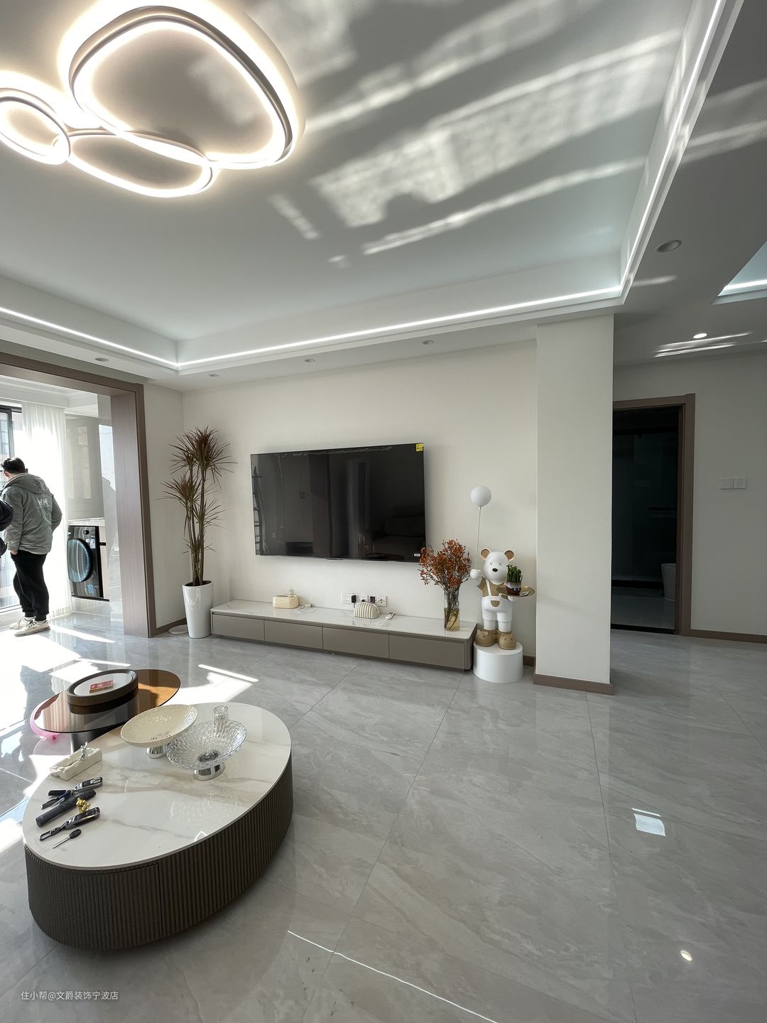 在颜色的选择也是简约的搭配,奶油白的墙面搭配浅咖色茶几和电视柜,双眼皮吊顶加灯带,配上吸睛的顶灯,超显高级感。