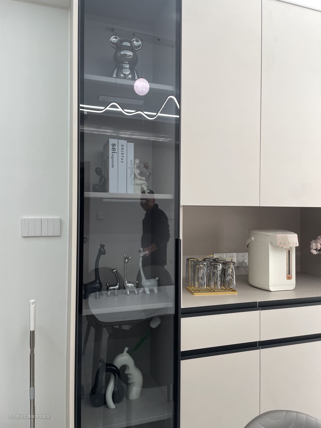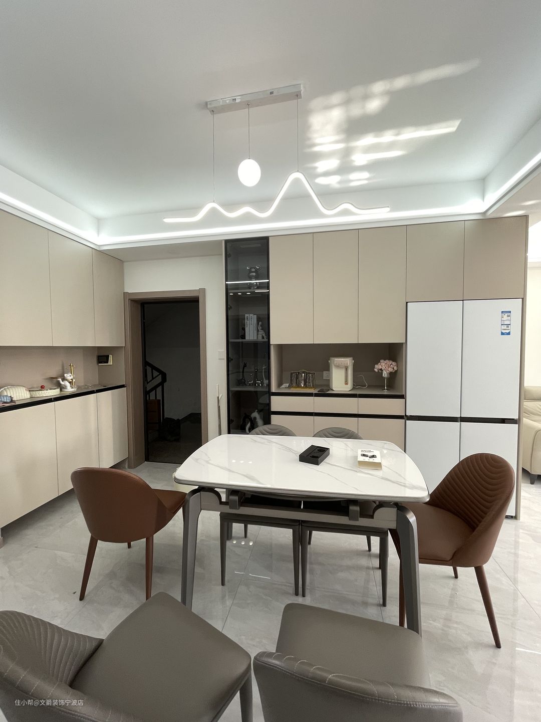 餐厅延续客厅的风格,白色大理石餐桌,浅咖色的餐椅,很唯美的造型灯,加增玄关柜和餐边柜,简约高级的同时增强实用性。
