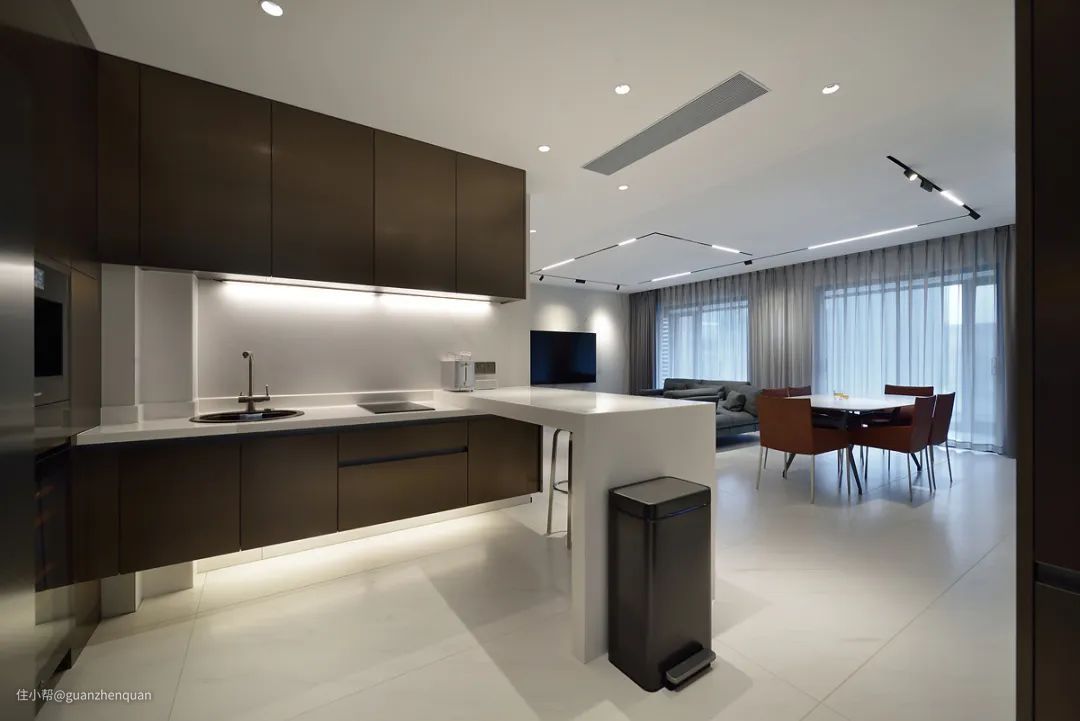 本案是一套位于上海静安的132㎡大宅,屋主宝先生和太太之前一直在国外生活,回国后购置的这套房屋为精装房,装修风格和格局都是经过开发商规划设计的,并不符合屋主一家的审美和需求。 因此,业主希望能够重新装修,将房屋打造成自己所喜欢的现代轻奢风,并采用自然材料,例如实木、石材、竹子以及一些传统材料,给人以自然、清新的感觉。在此基础上,加上现代主义手法的概念和元素,创造出更简洁流畅、具有现代感的空间。 改造后的设计亮点: 1)、客餐厅一体化:在家具、装饰与空间设计方面,采用分隔明确的风格和设计布局,来定义空间的范围,让屋主在视觉上更容易区分两大功能区,并且让整个空间的布局更加分层,协调。 2)、西厨岛台设计:这是一种基于家庭生活需要和社交活动的新型厨房,注重厨房与客厅及餐厅之间的连通,轻松实现备餐、烹饪、用餐和娱乐同时进行,满足了现代居住者对多元化生活方式的要求。 3)、运用大量大理石:大理石经过多种处理方式,通过抛光、镶边、切割等工艺处理使其既保持天然原貌,也呈现出更多的艺术形态和个性化特点,提高了整体生活环境的品质。