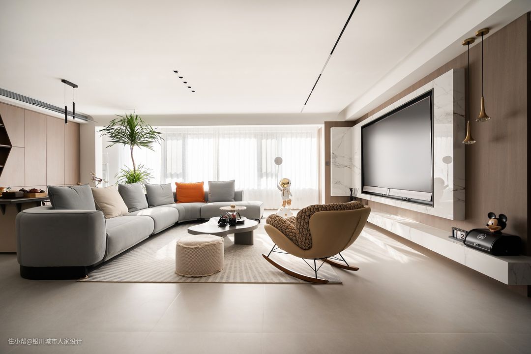 全屋大量使用木元素与简约色彩形成呼应,组合出纯粹简练的视觉体验。沙发特意选择灰色调,成为木色与白色的过渡色系,让空间更显层次和质感。 以沙发为界,后方是喝茶读书区域,整面定制储物柜,两列开放格做了异形设计,创意感十足,在这里摆上业主收藏的物件,互相为对方的颜值加分!寻找到了储存和装饰的完美平衡。