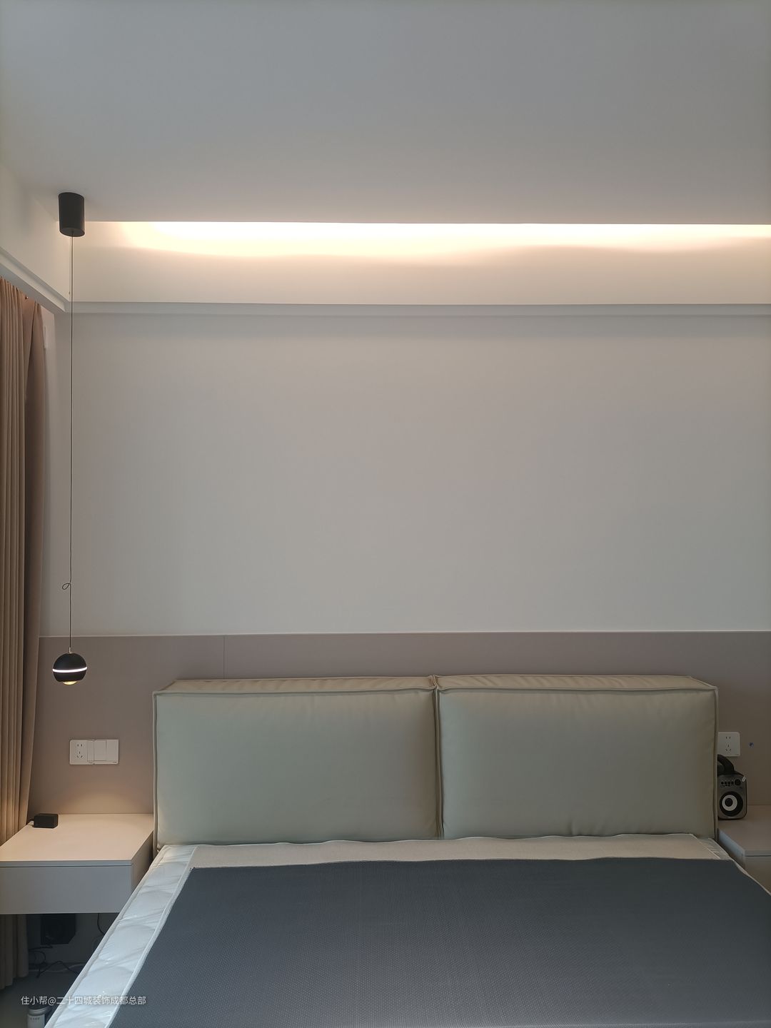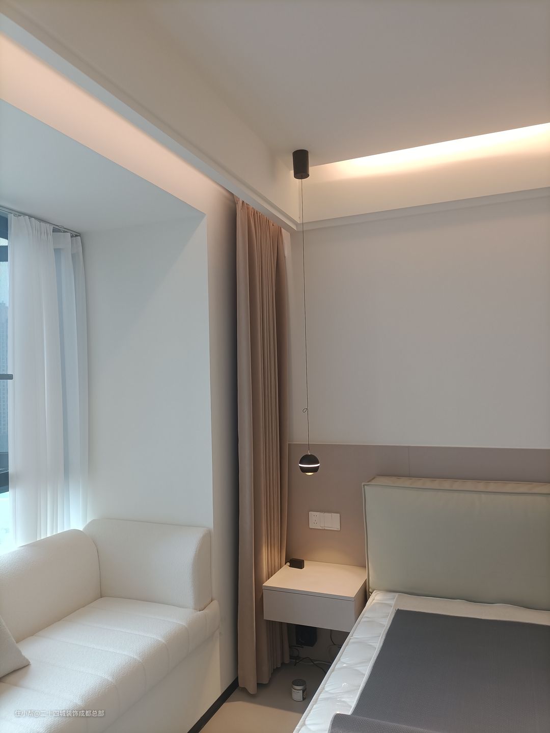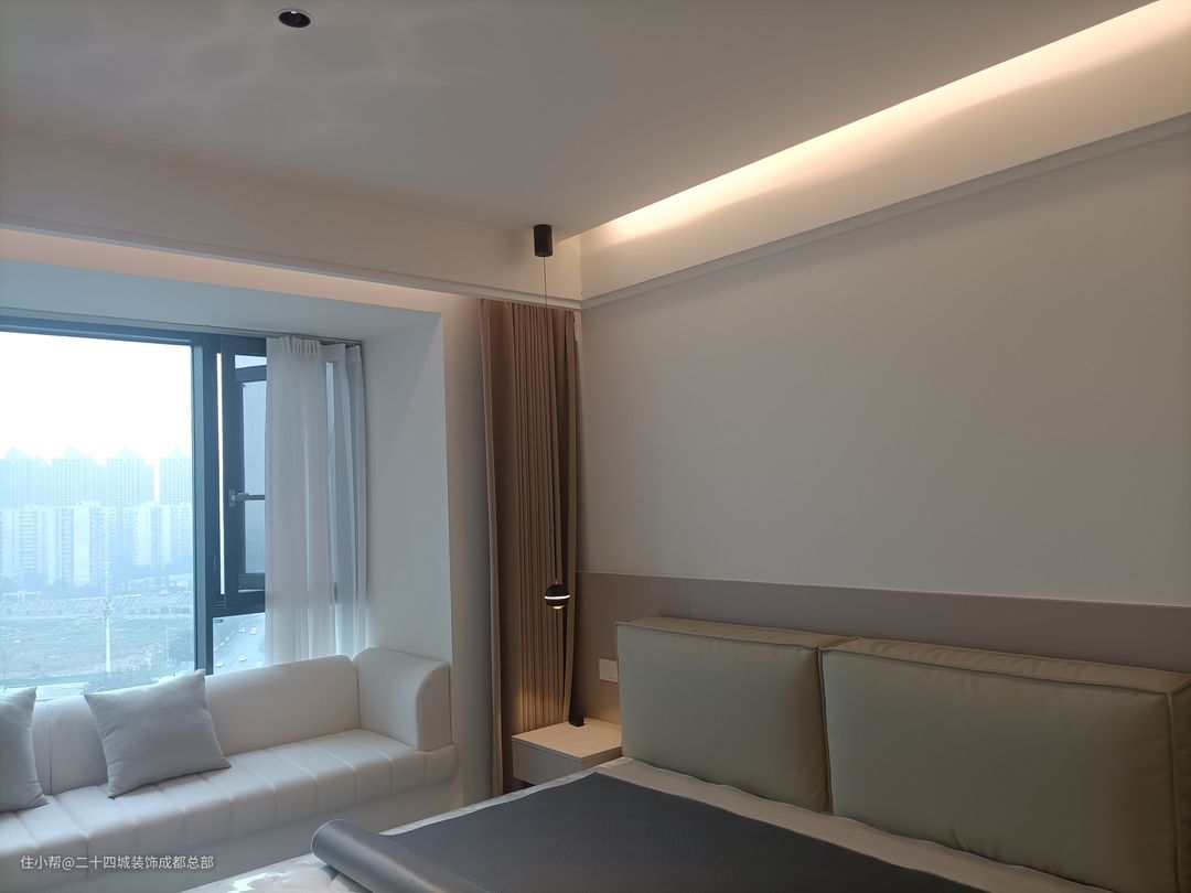 主卧空间宽裕,自带卫浴设施。采用双眼皮吊顶设计,配以灯带与射灯作为主要照明,不仅不显得压抑,更显出小资生活的精致与品质。 保留飘窗台,为飘窗台量身定制了一套沙发垫,可以和姐妹在这里喝喝下午茶。