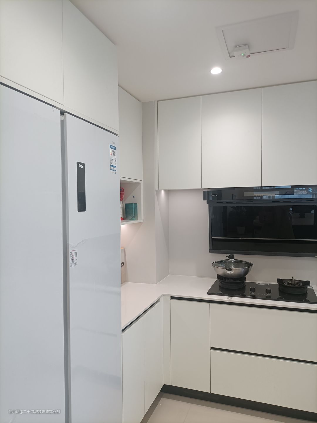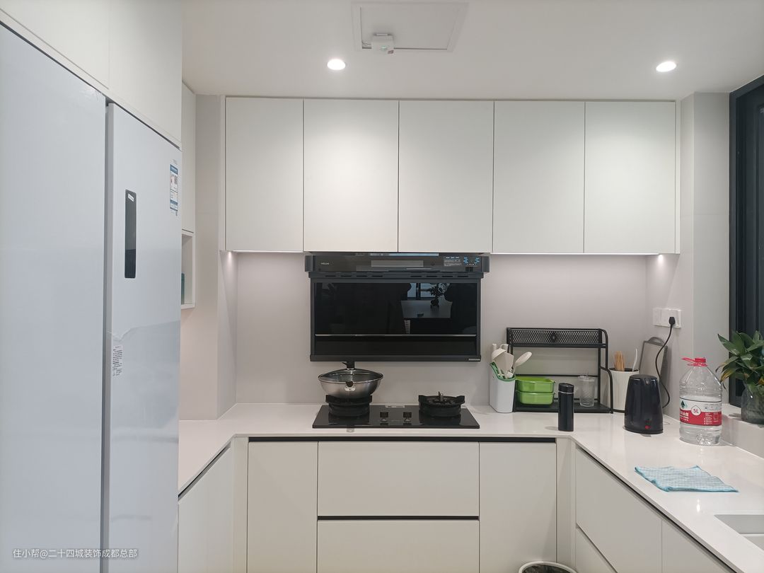 厨房户型方正,空间利用得当,带有一个生活阳台,设计师巧妙地将厨房和生活阳台分离,打造了一款经典的U型橱柜布局。 在厨房侧边预留出足够的空间,让冰箱能够完美嵌入。合理规划厨房布局,确保冰箱有足够的空间摆放,同时也方便您取用食材。