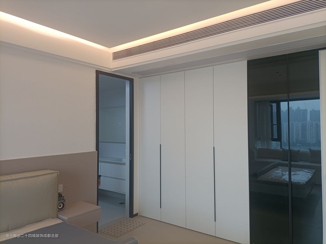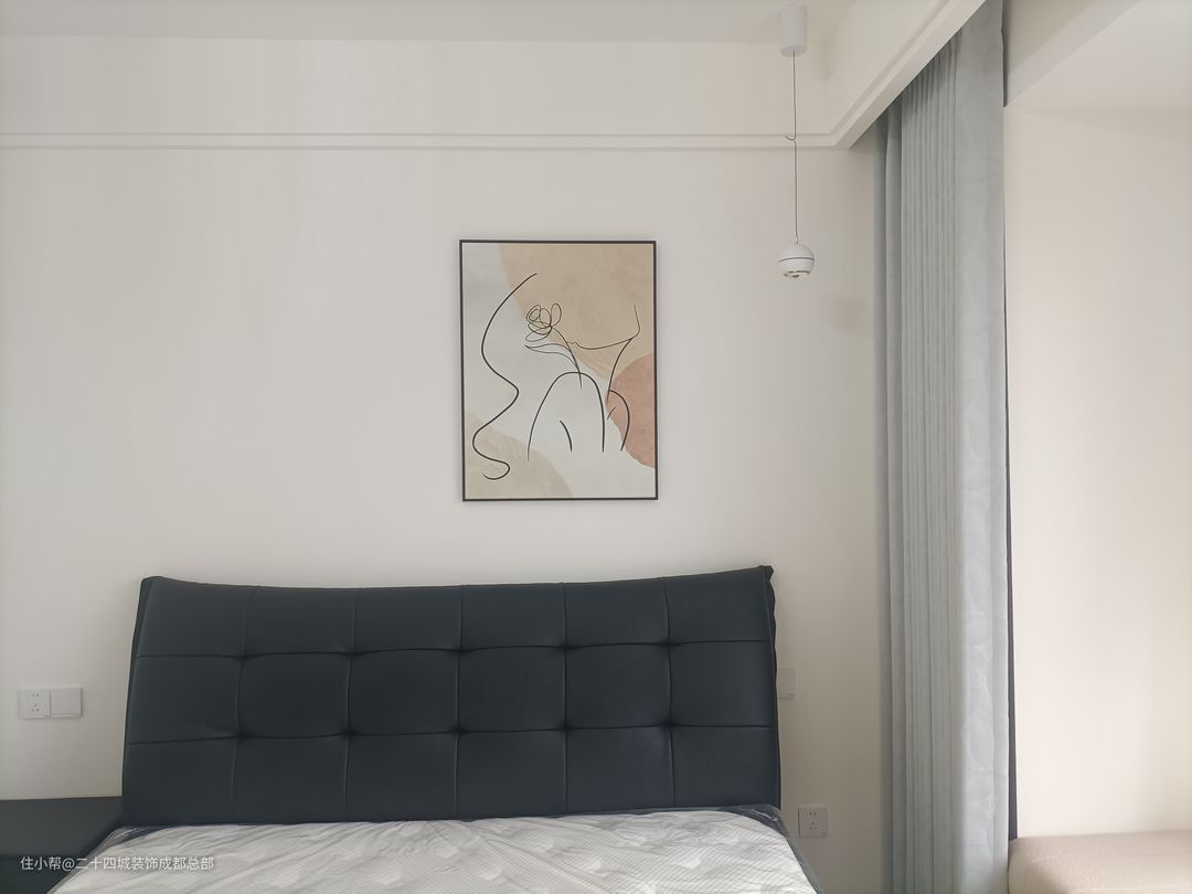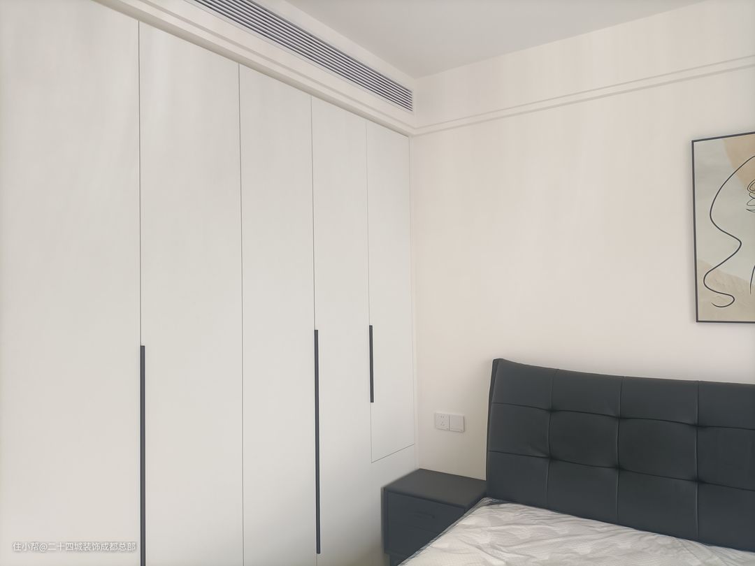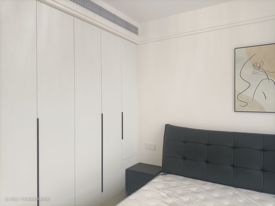 次卧整体以简约实用为主,靠墙做一门到顶的大衣柜,最大化利用空间,满足日常的收纳,同时黑白配的经典配色彰显业主的品质生活。