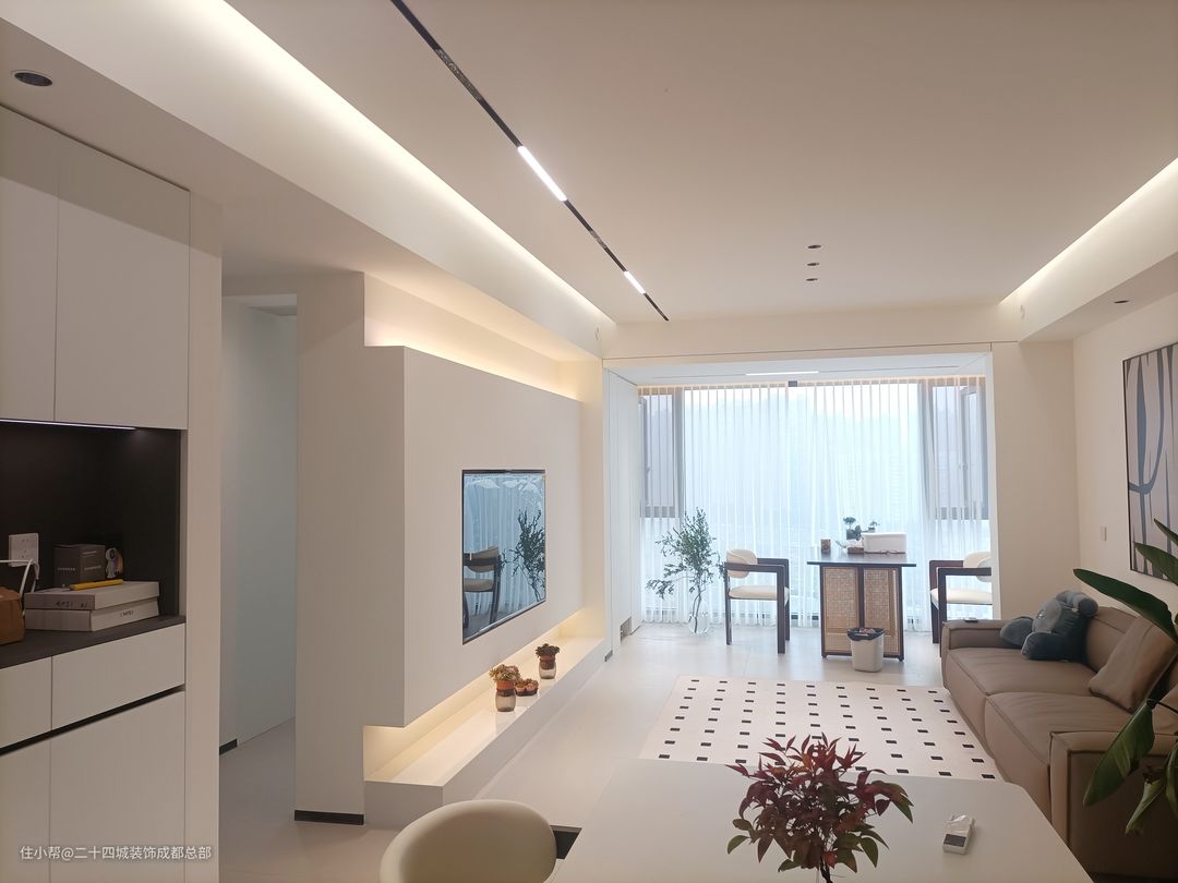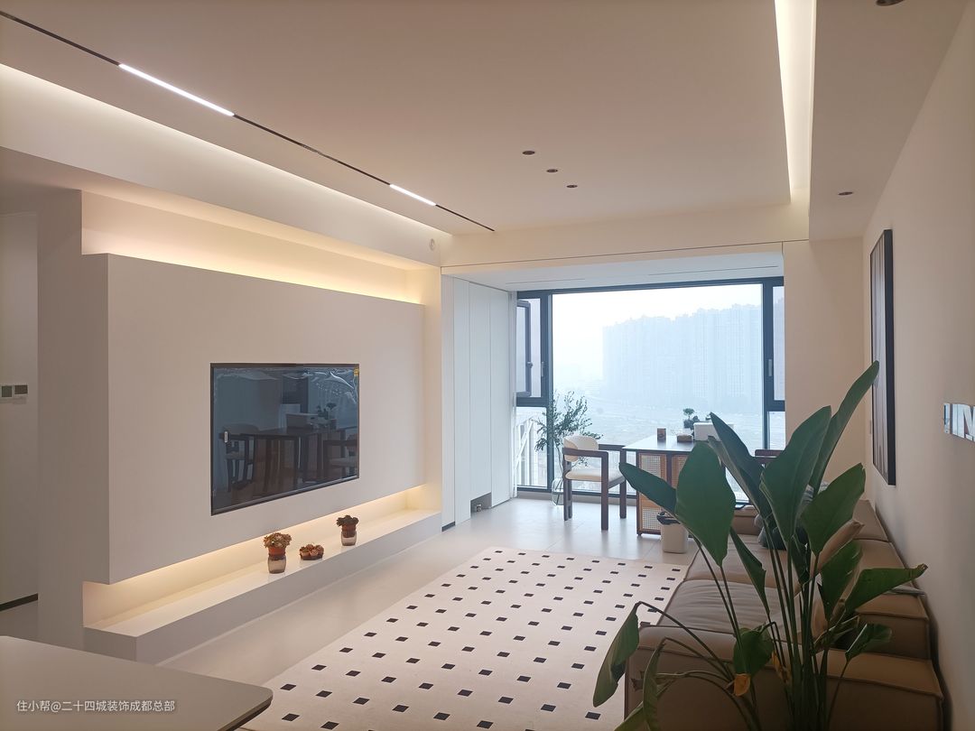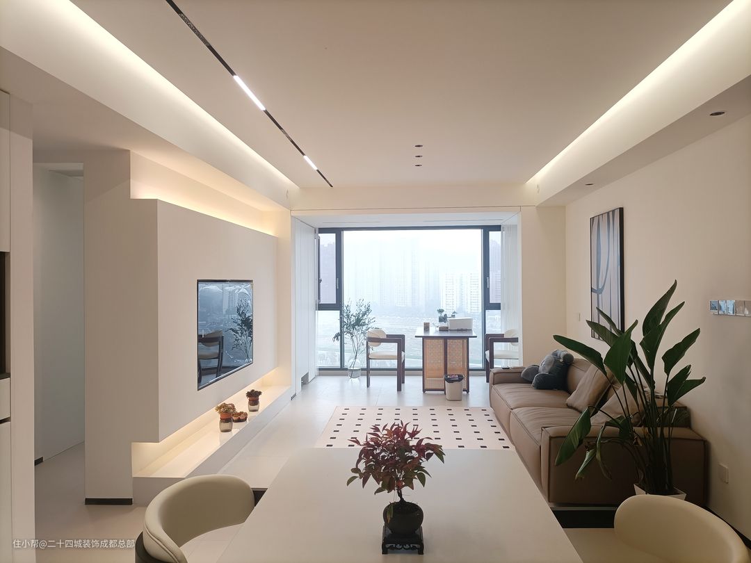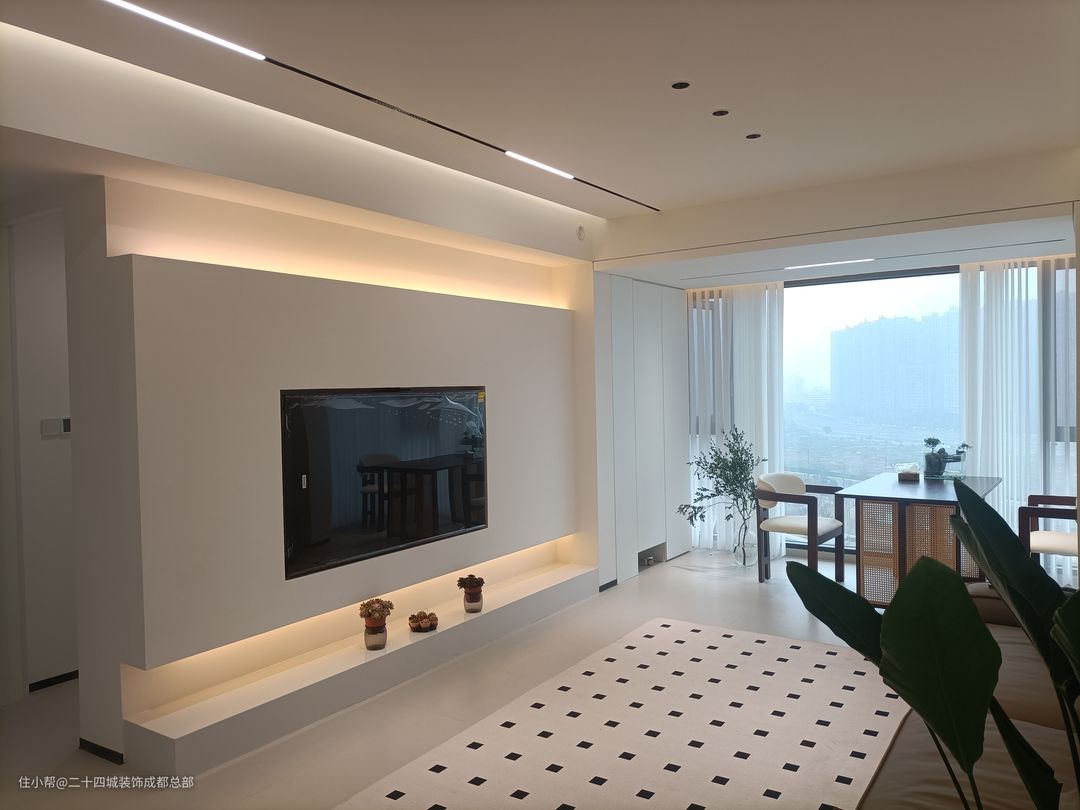 客厅全景落地窗设计,一览无余的风景让生活空间更加宽广。当阳光洒进,仿佛为你的生活空间增添一份自然的诗意。配合无主灯设计,光线柔和而均匀,使得整个空间通透而不压抑。 悬浮式电视背景墙底部内嵌灯带,为客厅增添一份优雅氛围。内嵌灯带设计不仅增强氛围感,更照亮你生活的每一个角落。内嵌式电视机设计,让设备、线路隐藏其中,为整个电视背景墙打造出极简的视觉效果。 白色作为背景墙的主色调,不仅简洁大气,更能突出其他家具和装饰的亮点。搭配上恰到好处的氛围灯带,整个空间立刻显得层次分明,营造出一种温馨而舒适的氛围。 在这样的设计中,电视柜的选择也至关重要。简约镂空石台成为了最佳选择,增添了几分艺术气息。同时也方便我们摆放一些多肉植物,为整个空间增添一份生机与活力。