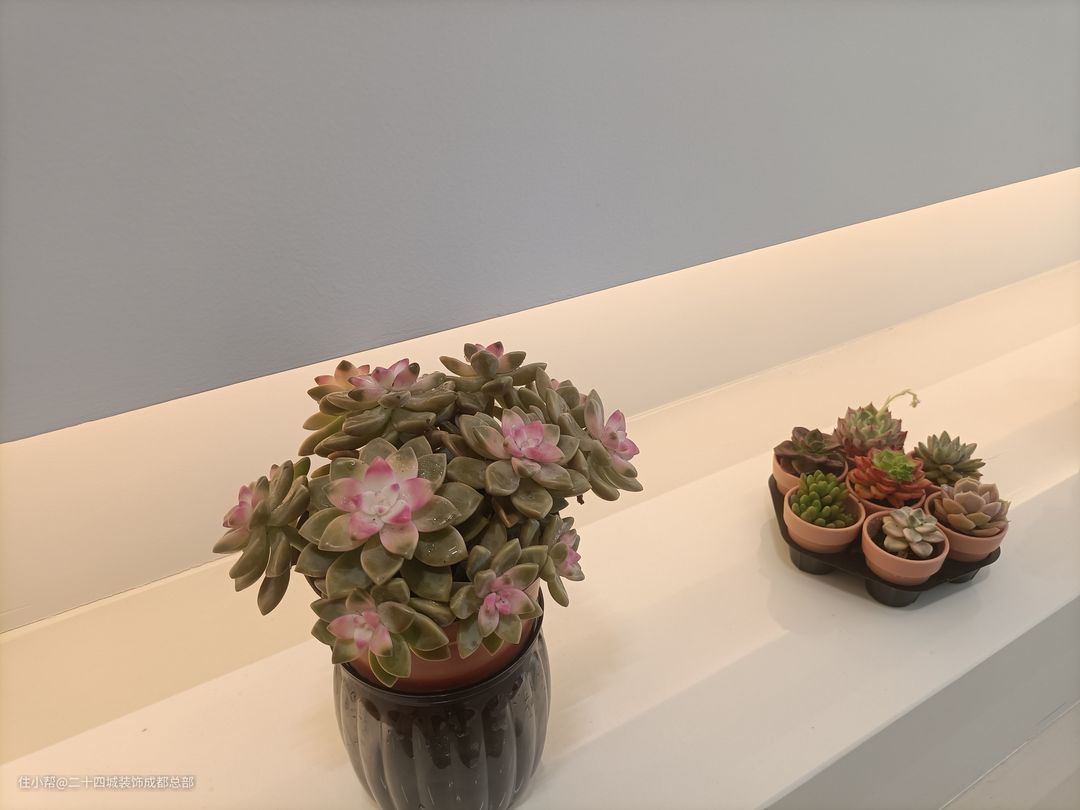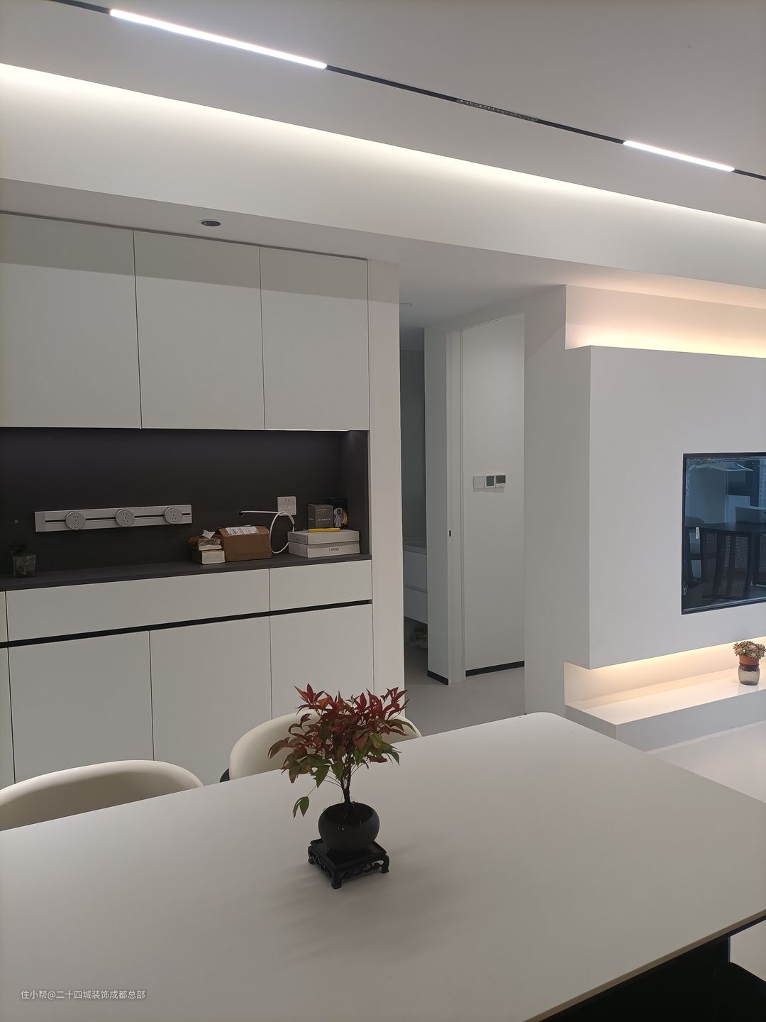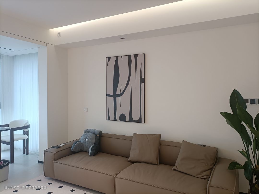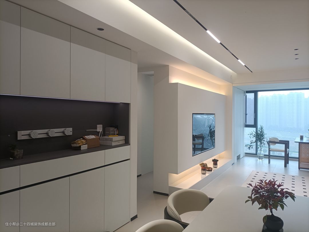 客厅全景落地窗设计,一览无余的风景让生活空间更加宽广。当阳光洒进,仿佛为你的生活空间增添一份自然的诗意。配合无主灯设计,光线柔和而均匀,使得整个空间通透而不压抑。 悬浮式电视背景墙底部内嵌灯带,为客厅增添一份优雅氛围。内嵌灯带设计不仅增强氛围感,更照亮你生活的每一个角落。内嵌式电视机设计,让设备、线路隐藏其中,为整个电视背景墙打造出极简的视觉效果。 白色作为背景墙的主色调,不仅简洁大气,更能突出其他家具和装饰的亮点。搭配上恰到好处的氛围灯带,整个空间立刻显得层次分明,营造出一种温馨而舒适的氛围。 在这样的设计中,电视柜的选择也至关重要。简约镂空石台成为了最佳选择,增添了几分艺术气息。同时也方便我们摆放一些多肉植物,为整个空间增添一份生机与活力。