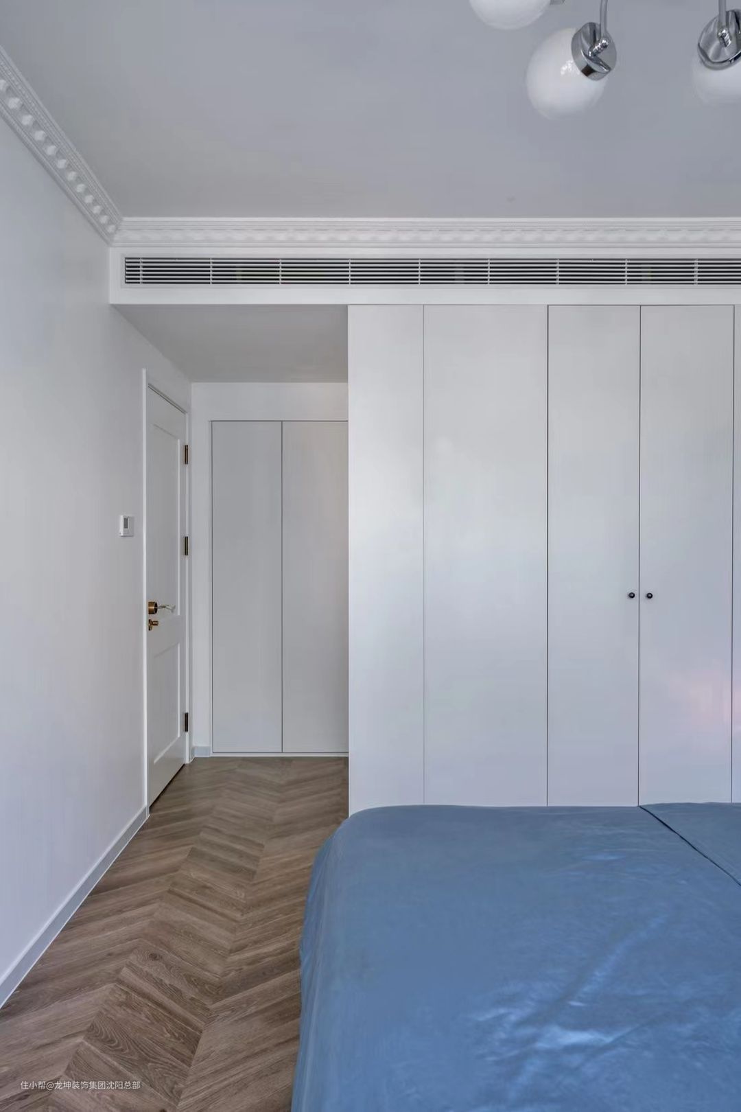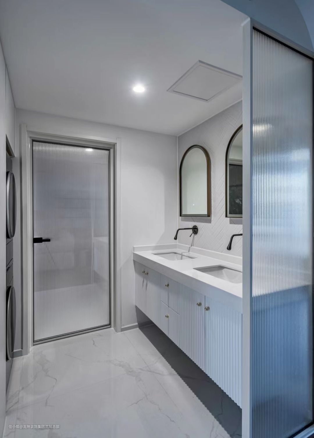 双盆双镜的设计,让每次洗漱时,多人也可以互不干扰,舒适而自由。通往湿区的长虹玻璃门白而美,还要选择内层磨砂,确保里面使用卫生间的人不会被看到,避免尴尬。这个洗衣房设置在干区,洗手池对面,洗烘套装的选择,节约晾衣空间的设置。