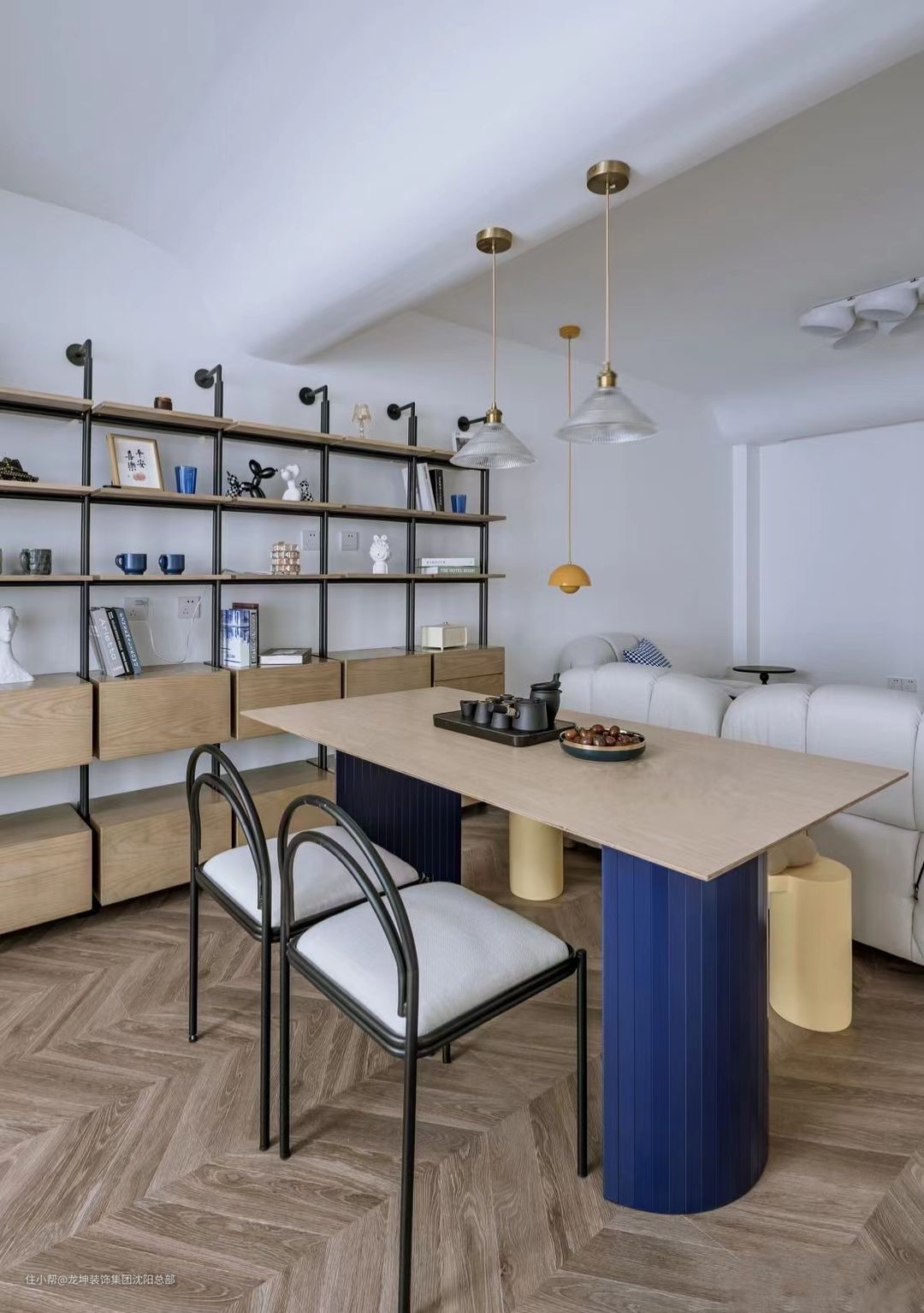 打造一面墙的书架和收纳柜,这套架子并没有使用传统的全木板打造,以黑色的烤漆金属为筋骨,原木色的板材相结合,上层为架子,下层为柜子。既可以放置书本,又可以展示心爱的装饰摆件。餐桌的半圆型的蓝色桌腿特别有设计感,搭配上铁艺简约造型的餐椅。
