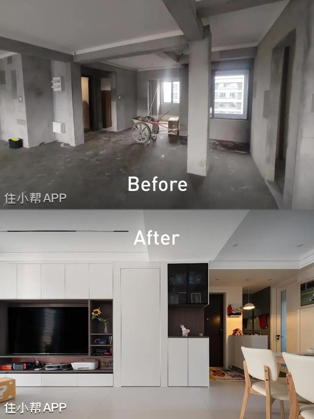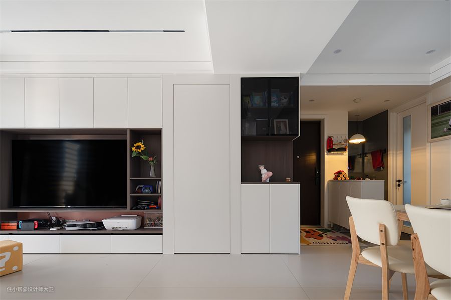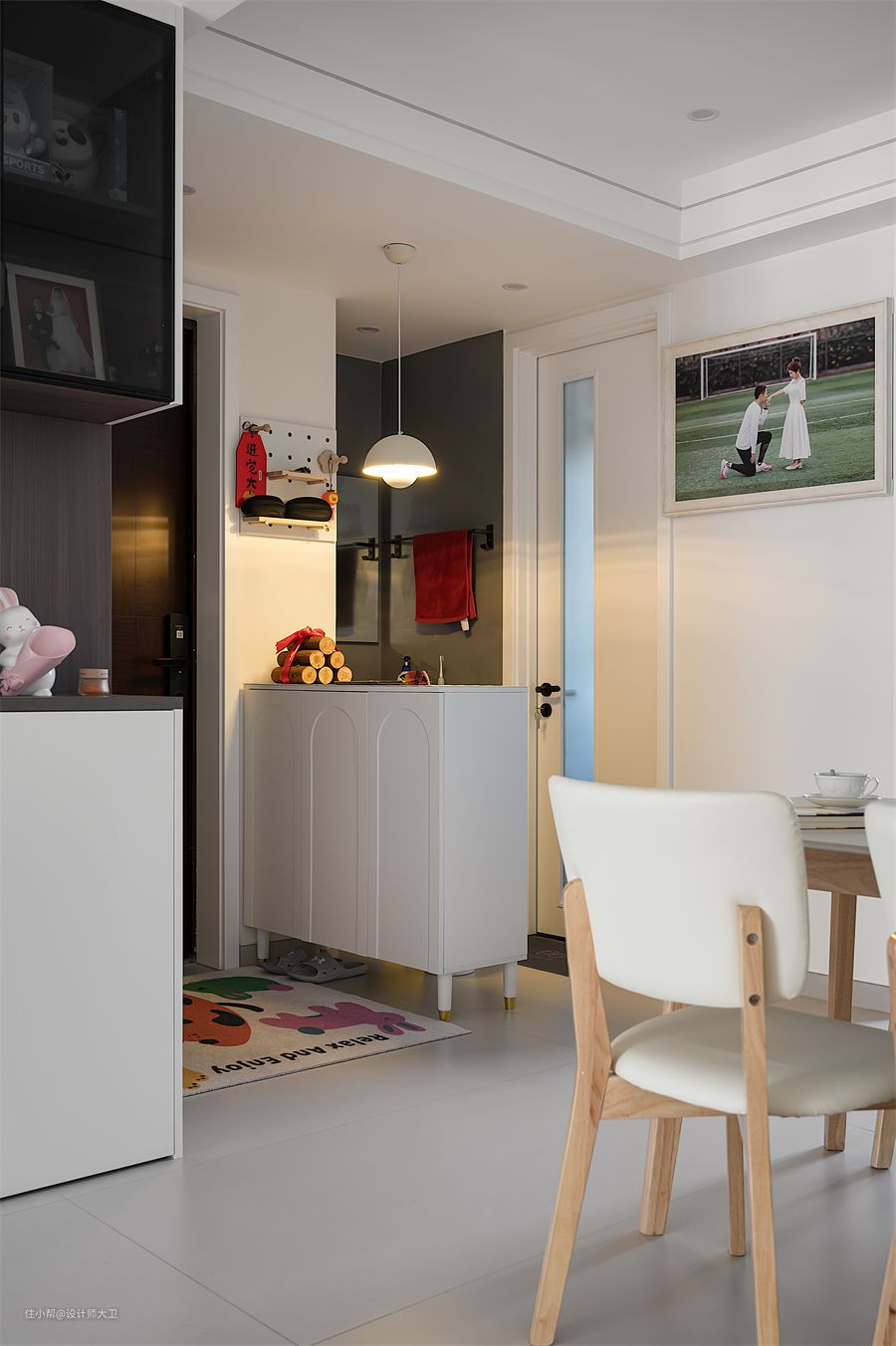 关于一进门就是卫生间的房型,再加上半墙柜设计再合适不过了。进门右侧是一组玄关柜,和电视背景墙做了衔接,满足日常进出门的收纳需求 在进门左侧放了一组半高柜,避免一进门就是厕所的尴尬,高柜用来放日常常穿的鞋子,墙面也利用洞洞板,做钥匙等挂件收纳。也能养成进门就洗手的好习惯