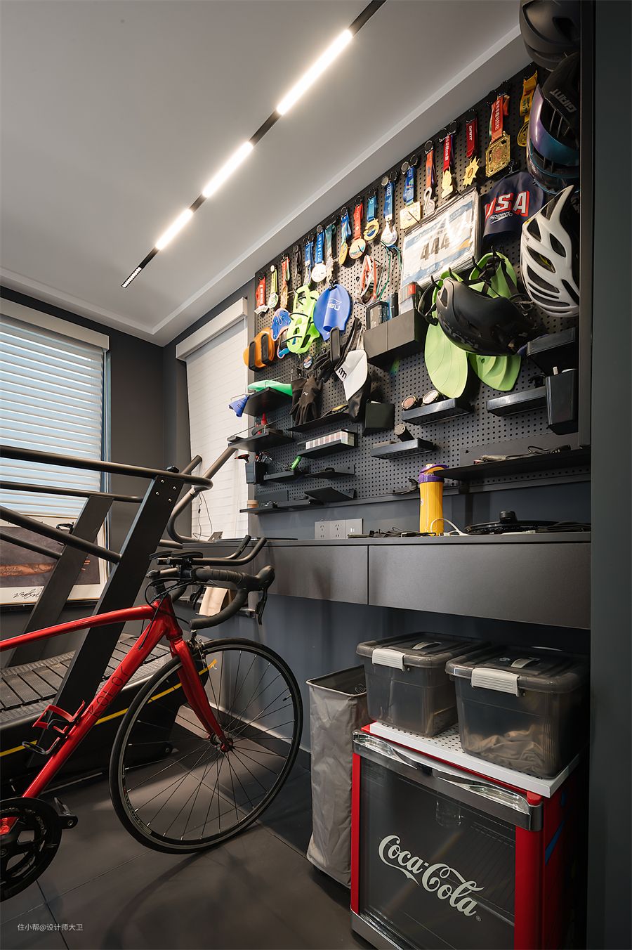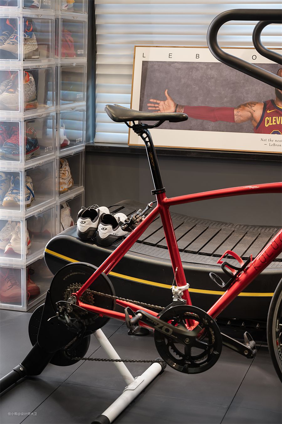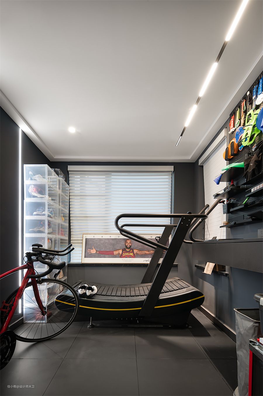 男屋主肌肉圆润紧实,爱健身,爱打游戏,很喜欢竞技类的游戏,是个爱拼爱竞赛的小伙子,又酷爱运动,特别喜欢铁人三项,跑步、骑车、游泳,所以特地设计了一个书房+健身房结合的空间